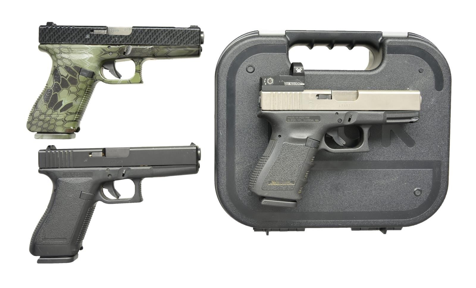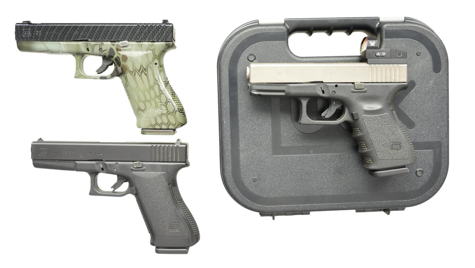 1) MODEL 21 SECOND GEN. Cal. 45 ACP. S# VZ451US. Bbl. 4 1/2”. Custom Kryptec matte finish frame w/ high gloss carbon fiber finished slide. Ported slide & bbl. Rear slide serrations. Original bbl. MAGS: 3 TOTAL. 1 - 13 rd. mag., 2 - 10 rd. mags. CONDITION: custom finish on both slide & frame appear somewhat recent w/ only a few light scratches. Bbl. finish thinning in areas of mechanical interface. Shiny bore w/ strong rifling. (20-3882/JZ). 2) MODEL 21 SECOND GEN. Cal. 45 ACP. S# ALD625US. Bbl. 4 1/2” Appears to be factory finish w/ very little use. Fixed factory dot front sight w/ white outline rear. Rear slide serrations. Replacement bbl. MAGS: 2 - 13 rd. mags. CONDITION: all aspects near excellent. Shiny bore w/ strong rifling. (20-3883/JZ). 3) MODEL 19 THIRD GEN. Cal. 9mm Luger. S# LTG321. Bbl. 4”. 2 Tone finish w/ satin stainless finished slide & original black poly lower. Mounted Vortec Venom 3 MOA sight missing battery cover. Rear slide serrations. American flag engraved back plate & dust cover. Original bbl. MAGS: 2 - 15 rd. mags. UNATTACHED ACCESSORIES: black plastic factory case w/ mag. loader. CONDITION: frame illustrates repetitive holstering below bbl. Slide finish lightly worn in serrated area. Shiny bore w/ strong rifling. (20-3899/JZ). ALL MODERN. $700-1,300.