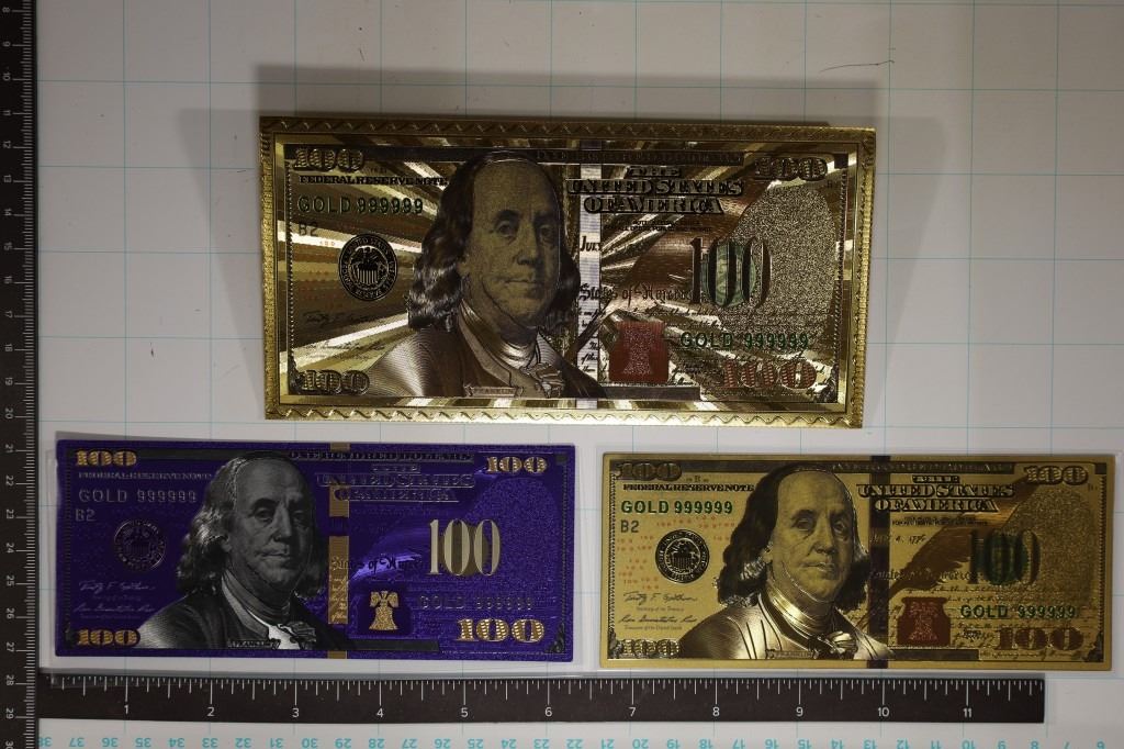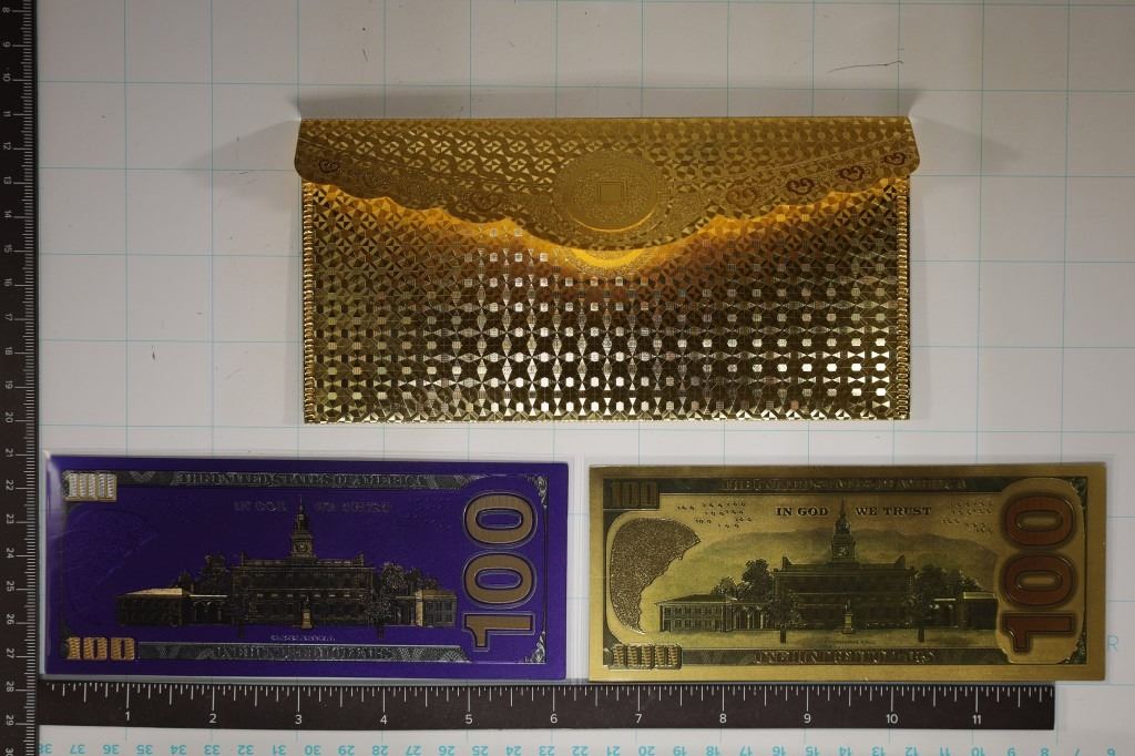 IS REGULAR GOLD COLOR AND ONE IS BLUE FOIL), BOTH ARE IN PLASTIC SLEEVES THAT ARE IN A VERY NICE DETAILED US $100 ENVELOPE. ALL ONCE AGAIN ARE 999999 GOLD FOIL AND VERY DETAILED, FANCY AND ALL CRISP UNC