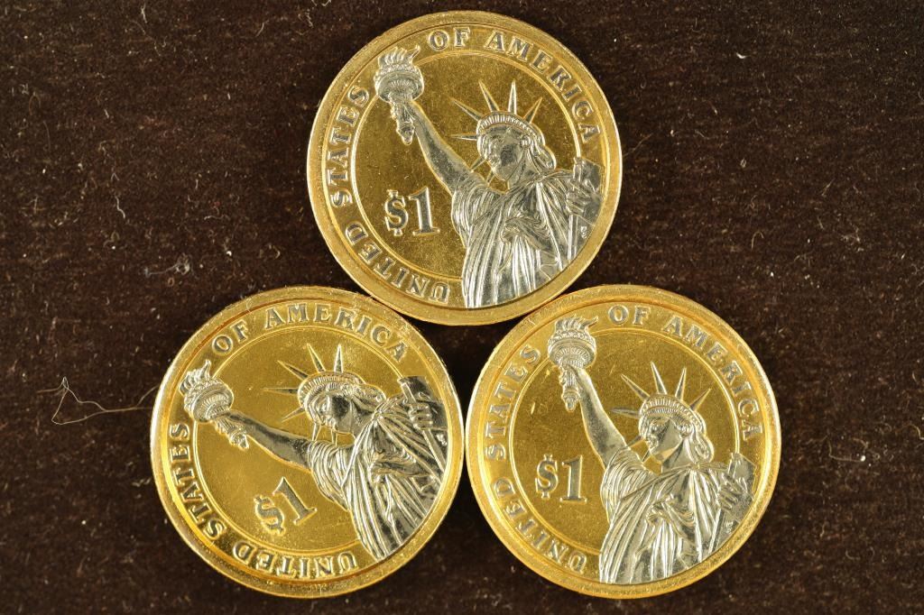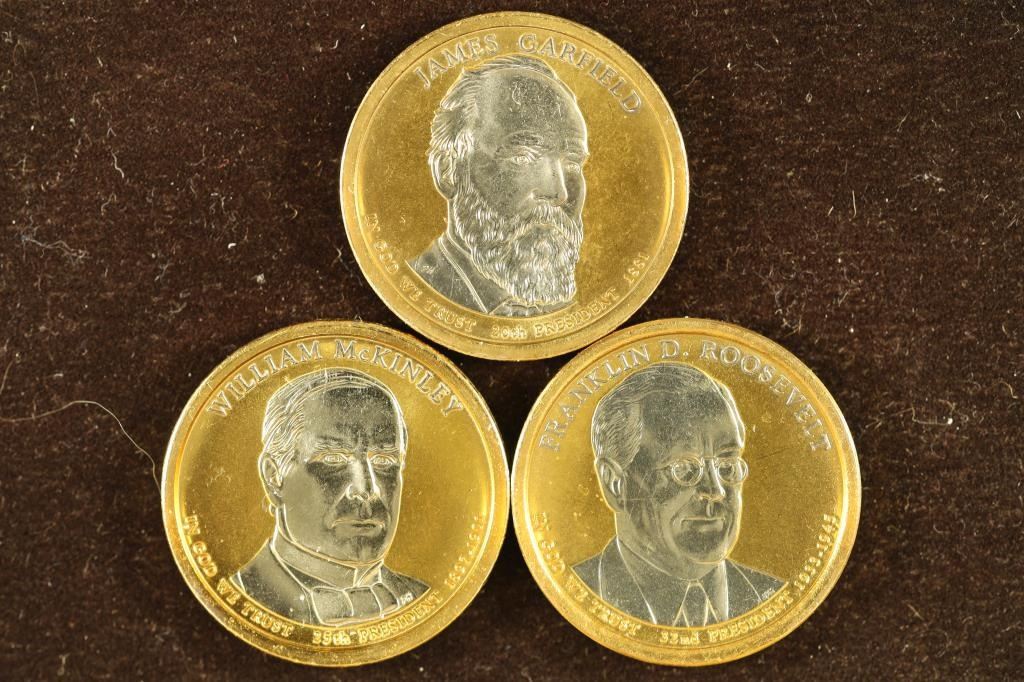 DOLLARS: JAMES GARFIELD, WILLIAM MCKINLEY AND FRANKLIN D. ROOSEVELT. EACH HAS AN ACRYLIC LIKE PROTECTIVE COATING ON THE COIN