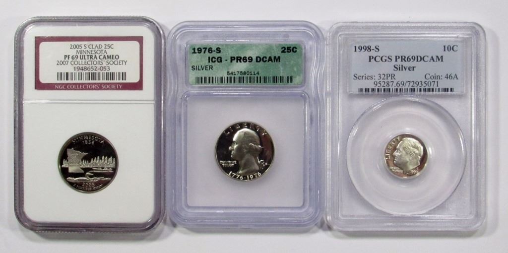 1998-S SILVER ROOSEVELT DIME PCGS PR69 DCAM 1976-S SILVER QUARTER ICG PR69 DCAM, 2005-S GLAD 25c NGC PF69UC MINNESOTA