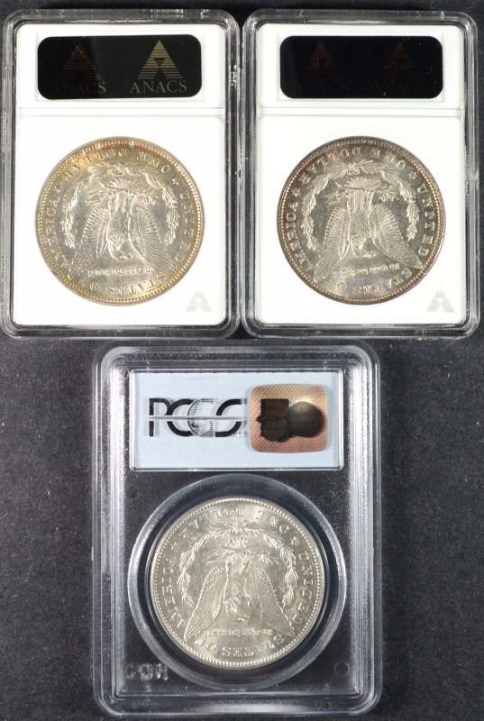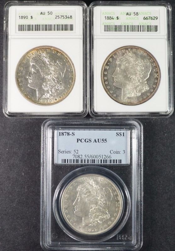 1878-S PCGS AU-55, 1884 ANACS AU-58 & 1890 ANACS AU-50, ESTIMATE, $140.00 TO $150.00