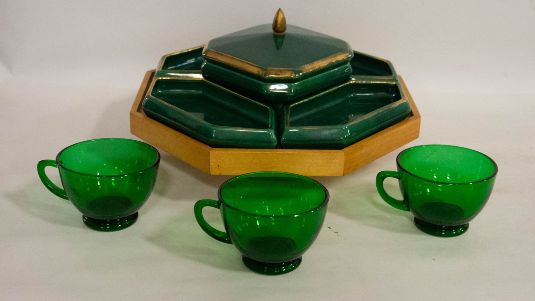 3 GREEN GLASS TEA CUPS, GREEN CERAMIC