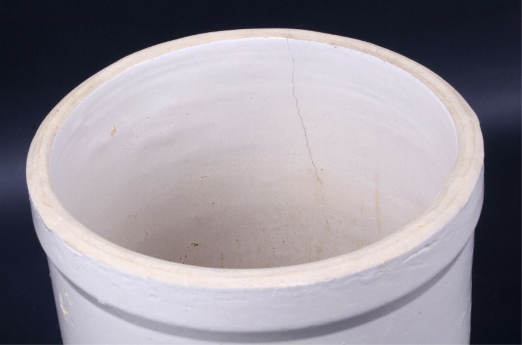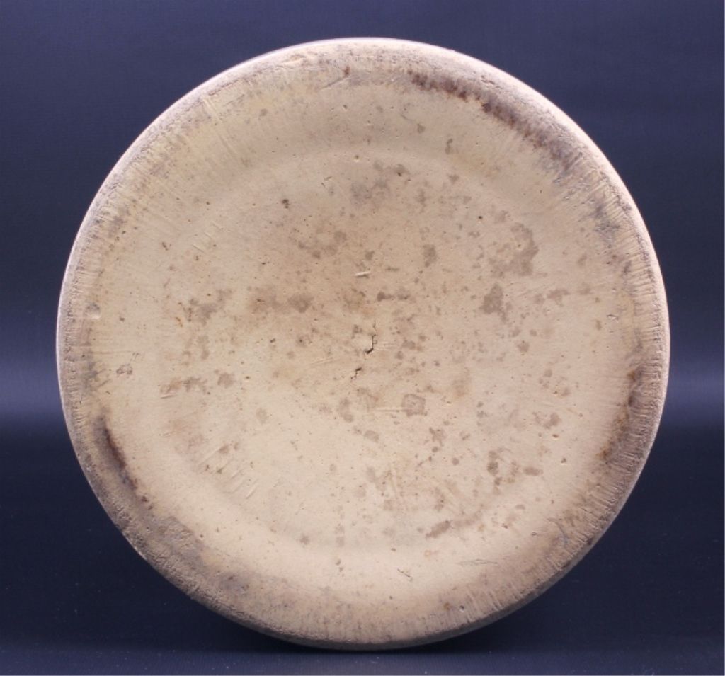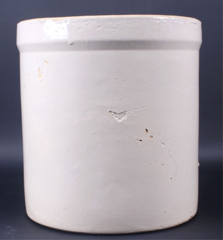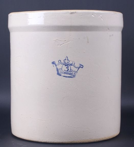This lot features a 3 gallon stoneware crock. It is in very good condition. The crown indicates it was made by the Robinson Ransbottom Pottery Co. of Roseville OH. This crock measures 10.5" in diameter and 11.25"tall.