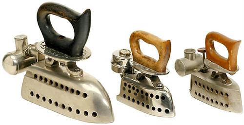 3 Spiritus-Bügeleisen 1) "Feldmeyer", Länge 21 cm. - Und: 2) "Omega", Länge 12 cm. - Sowie: 3) "Flott", Länge 13 cm. - Alle Eisen komplett mit Tank und Brenner.