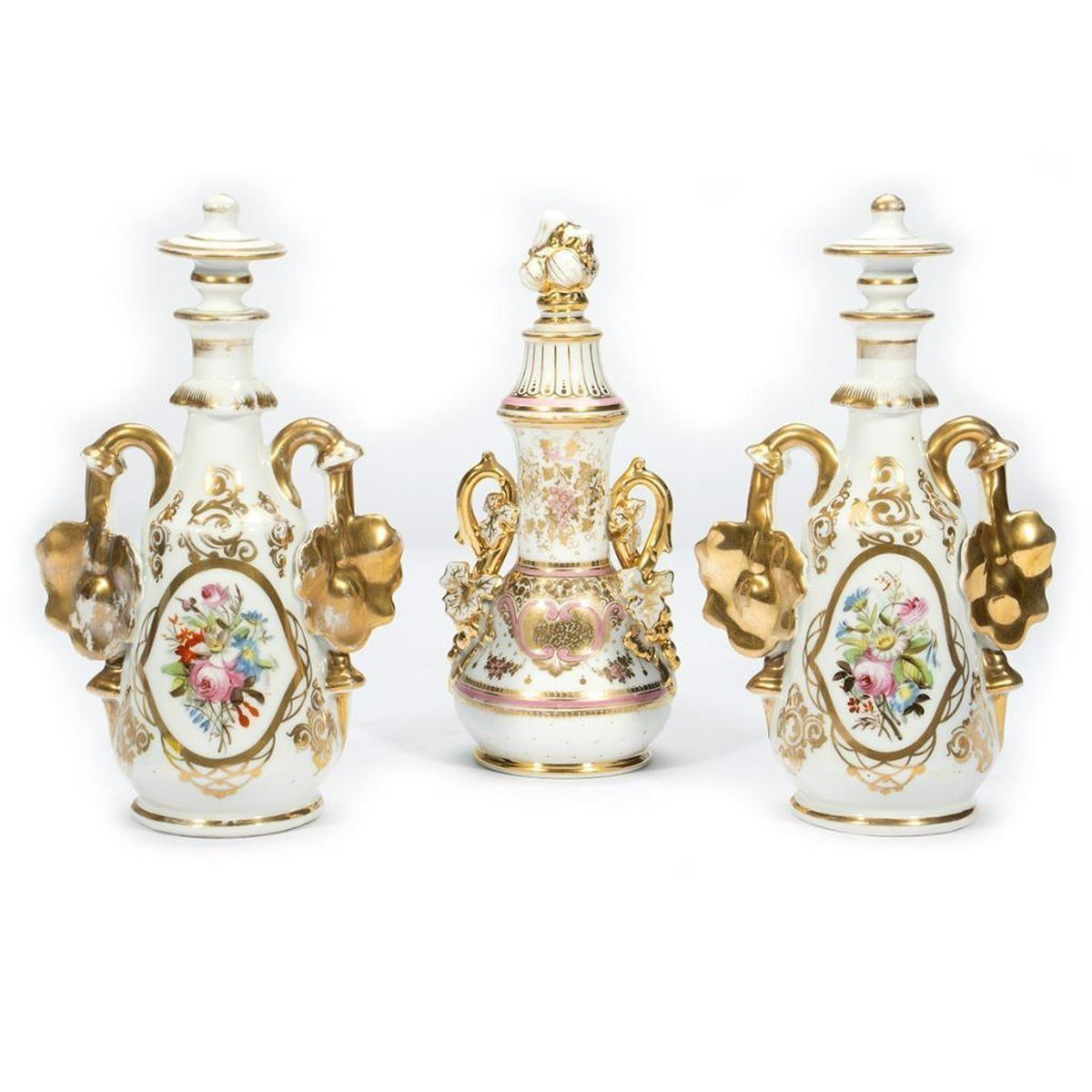 Including a matching pair with central floral decorations; and one with pink grape decoration; all unmarked. Pair: 9 1/2in. h. Single: 9 1/4in. h. Condition: One with chip to glaze on back; all with wear to gilt.