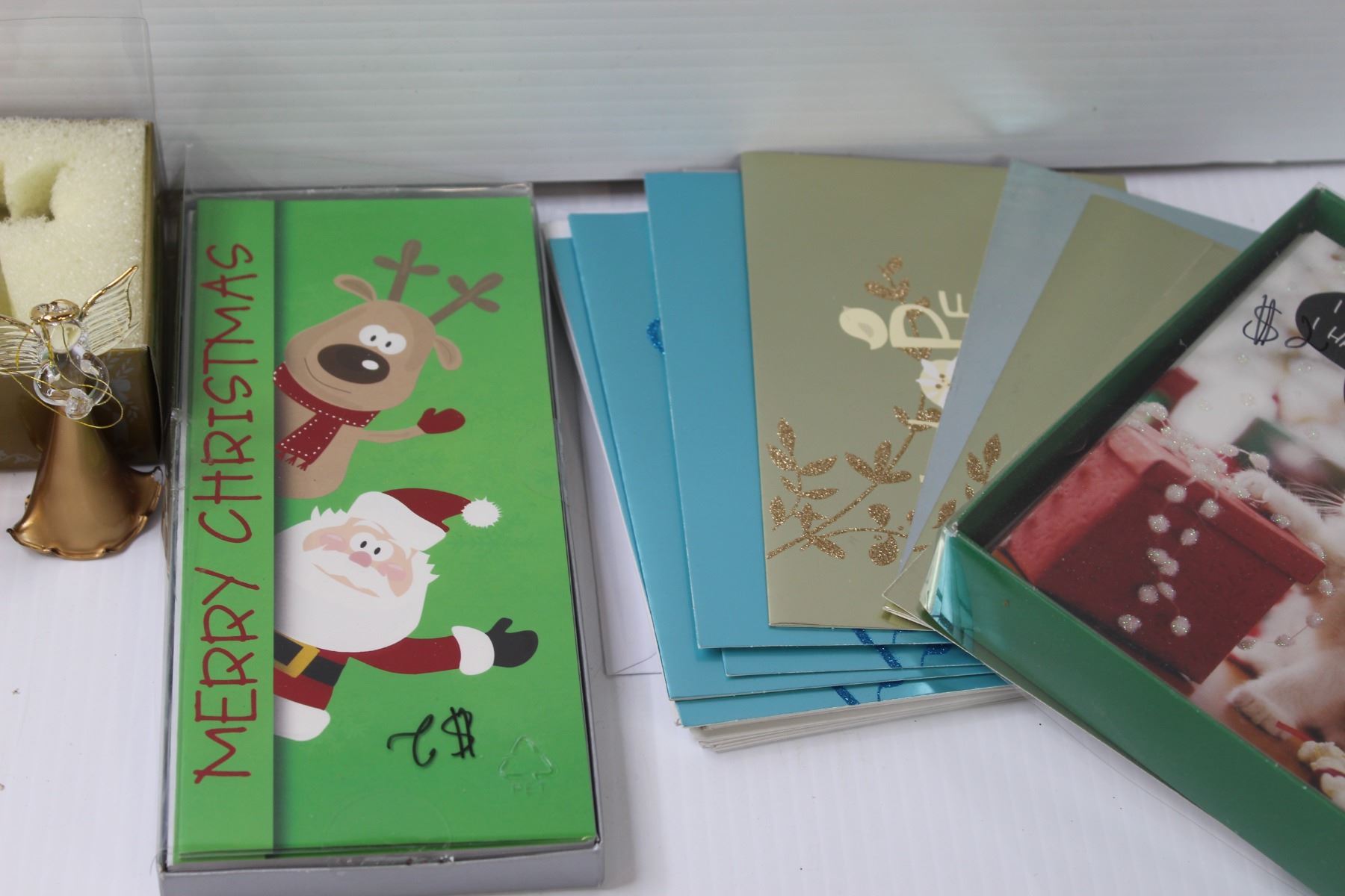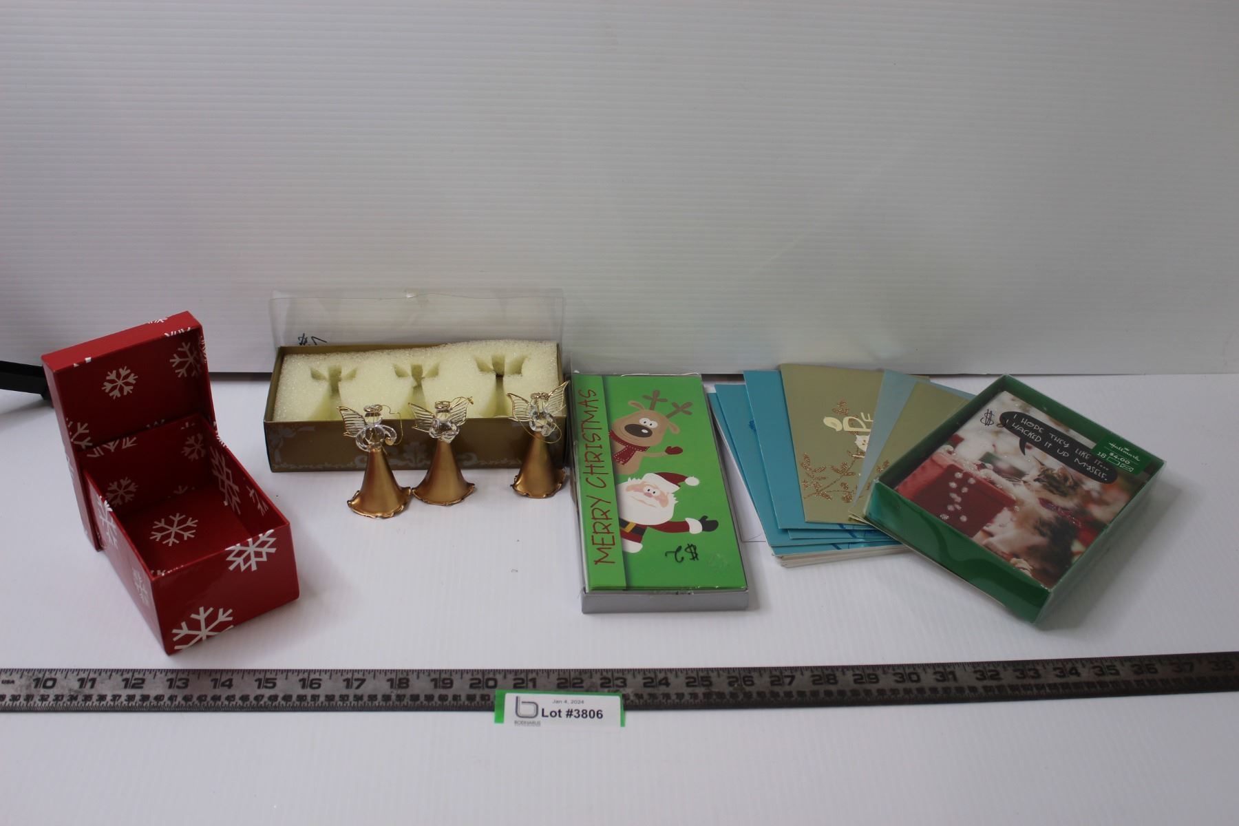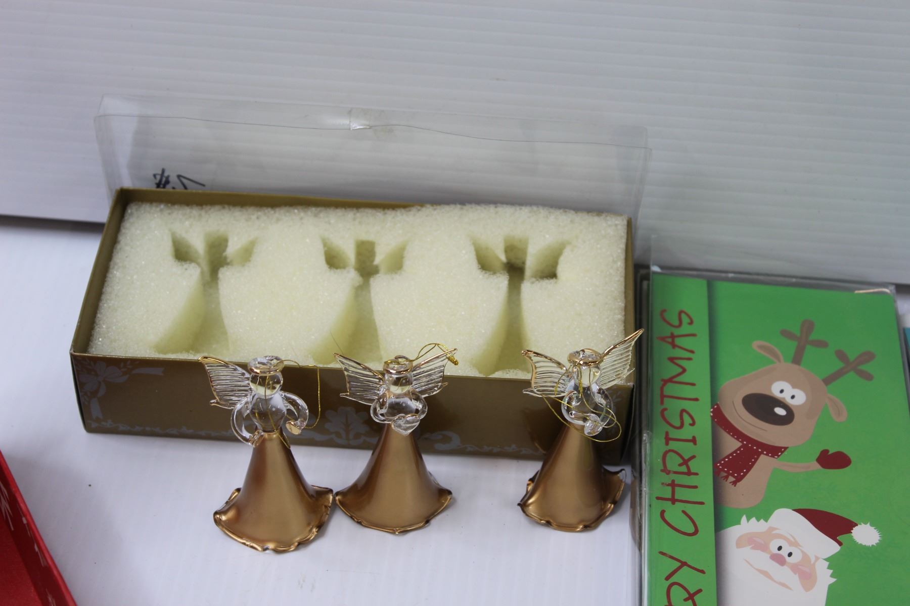 (3) Glass Angel Ornaments, Assorted Christmas Cards, Snowflake Gift Box