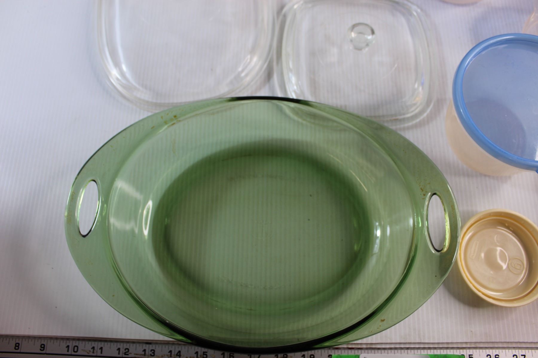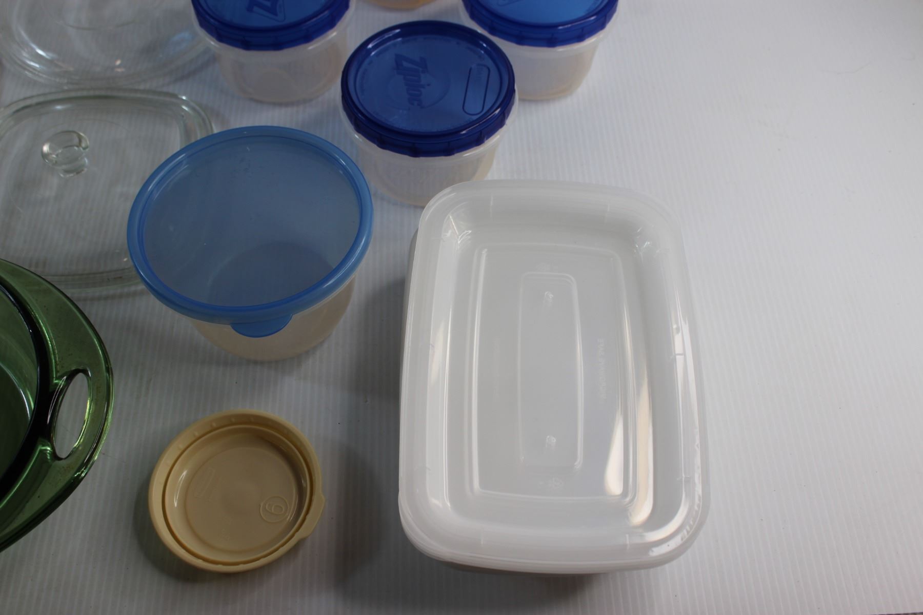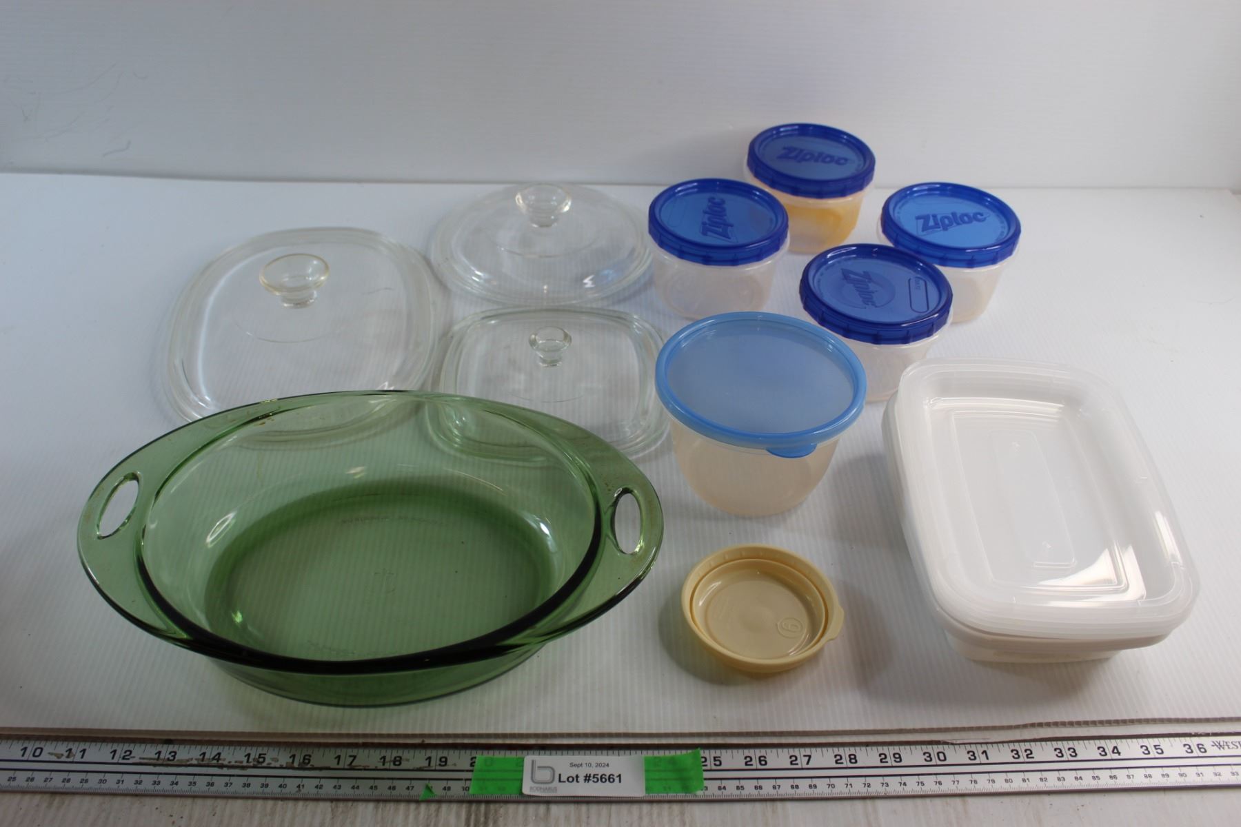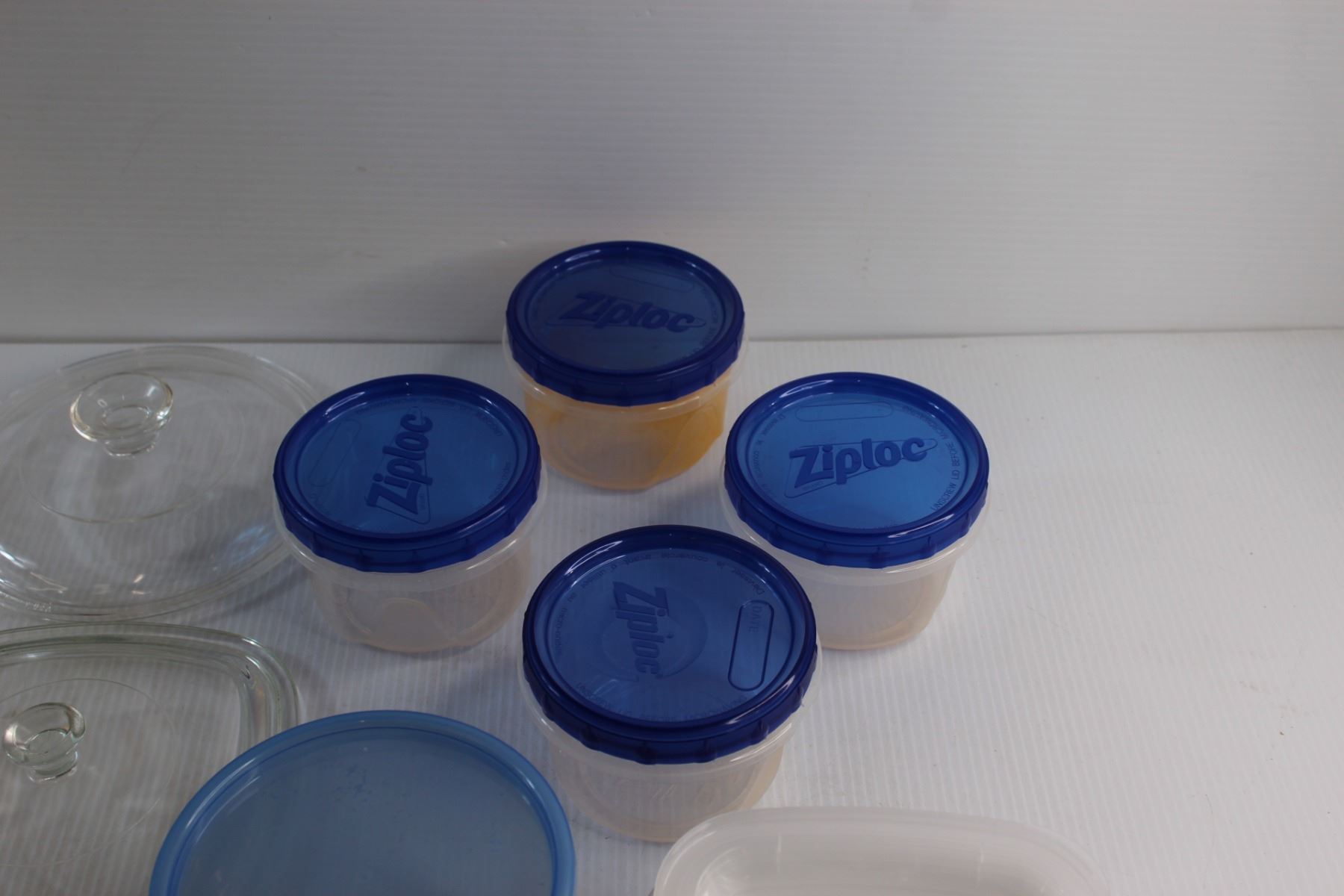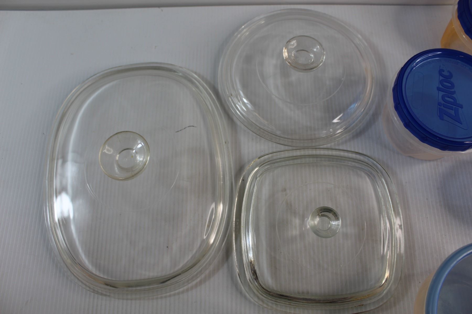 (3) Glass Lids, Casserole Dish, (4) Ziploc and Assorted Containers
