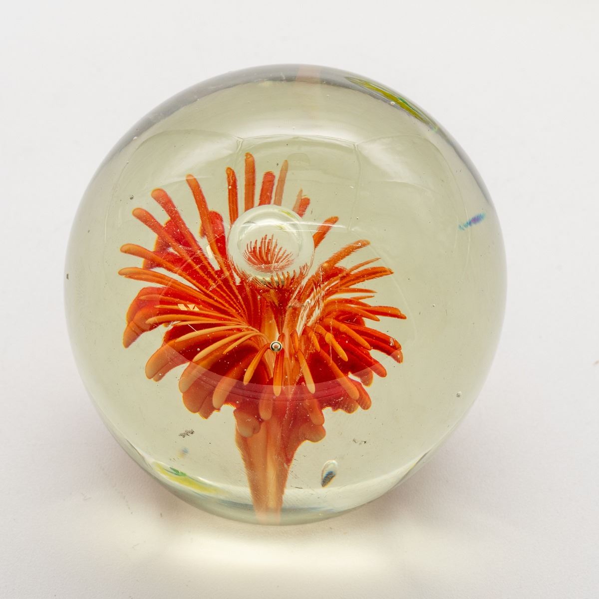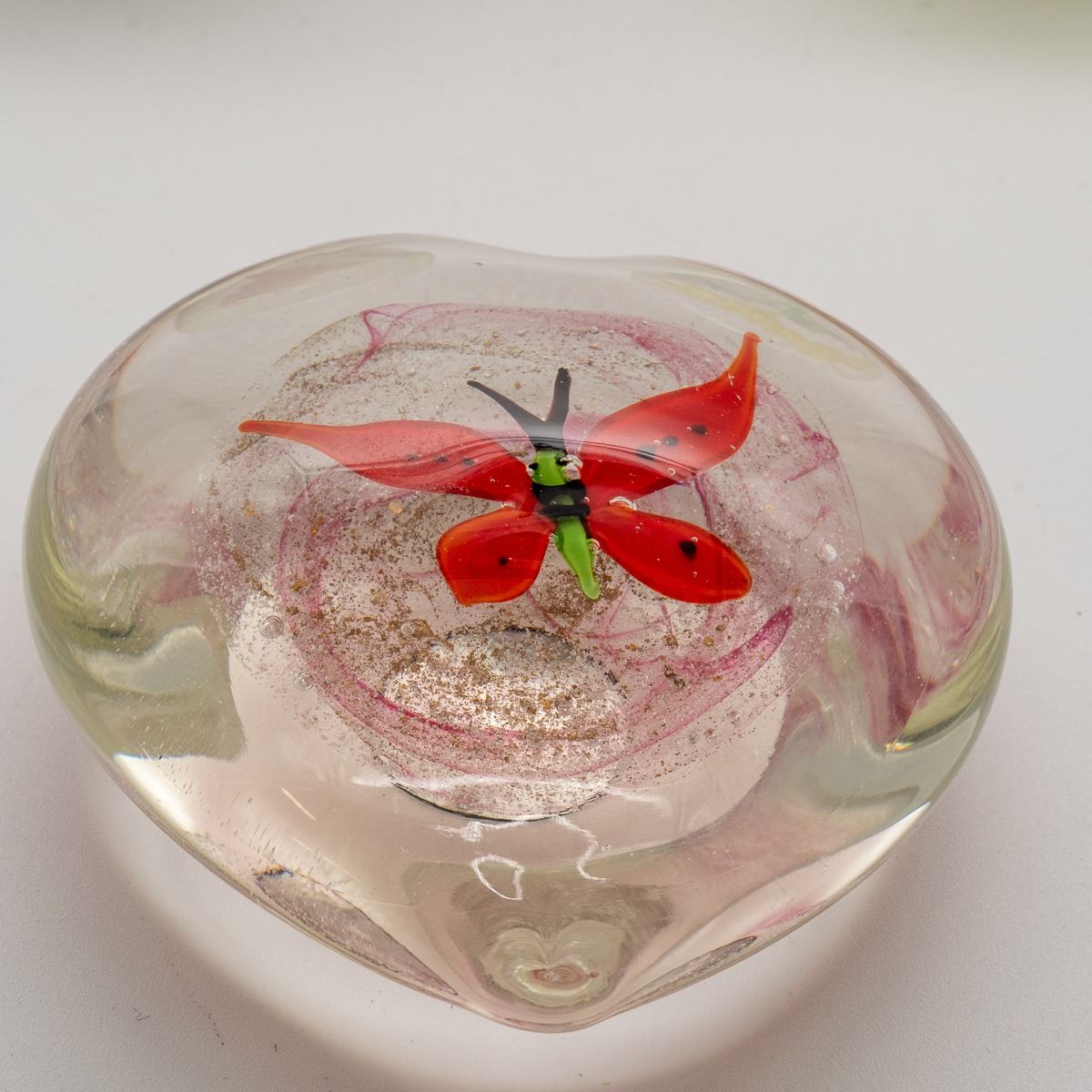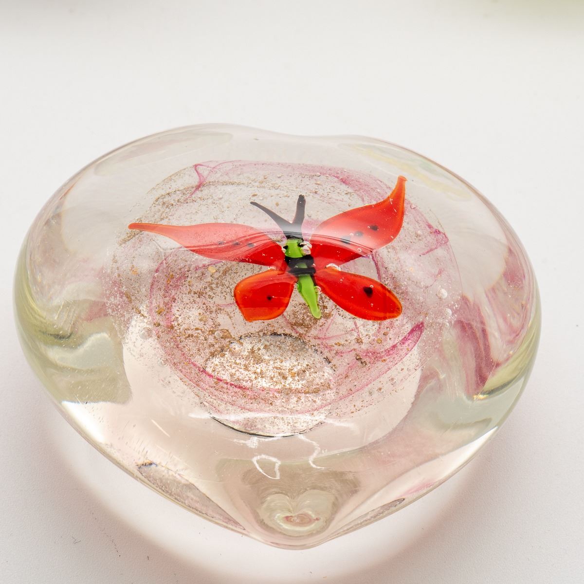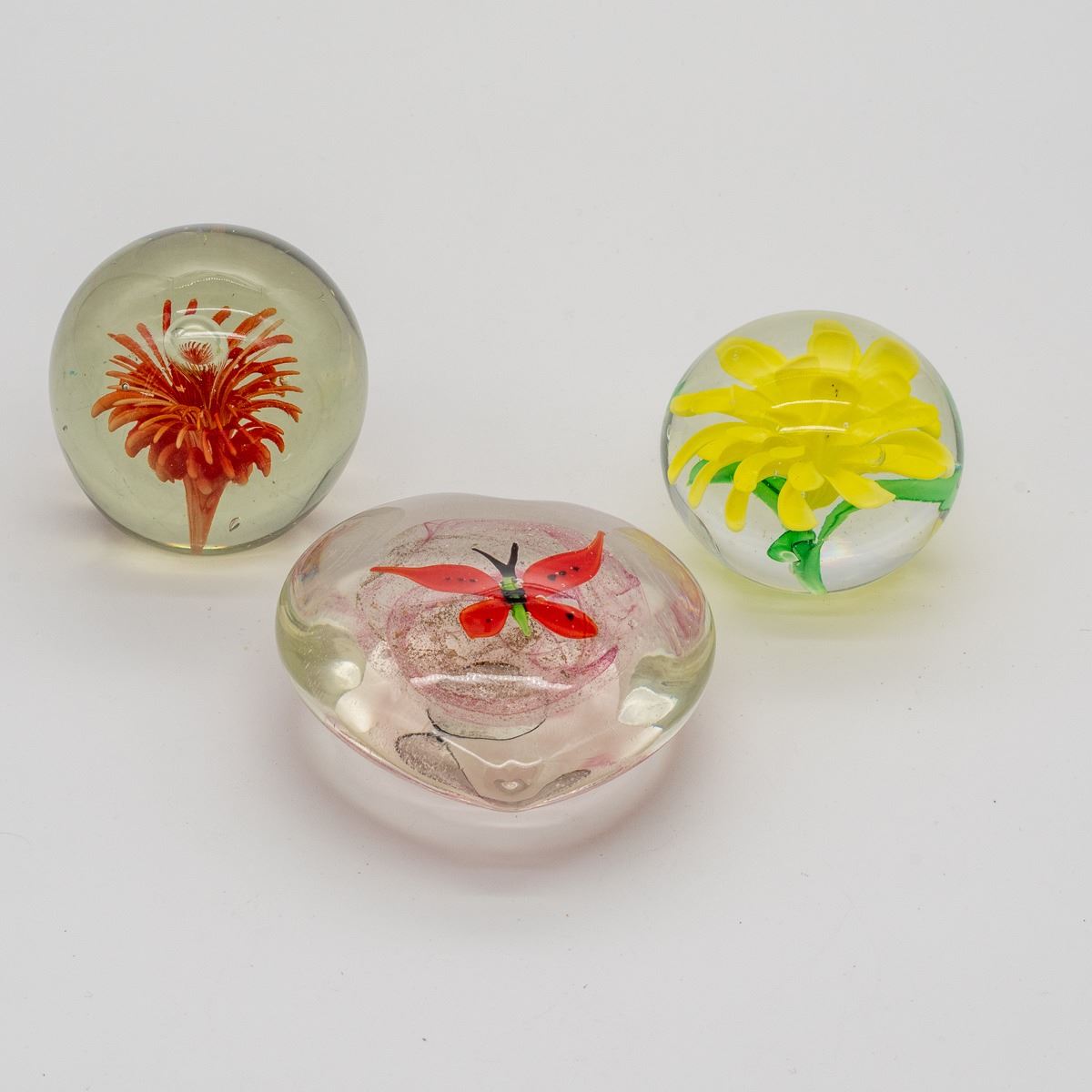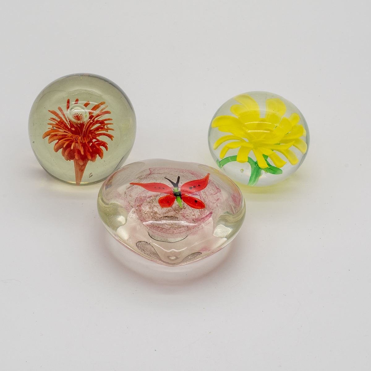 3 Glass Paperweights, largest measures 3.75'' x 3.75'', includes butterfly and 2 flowers