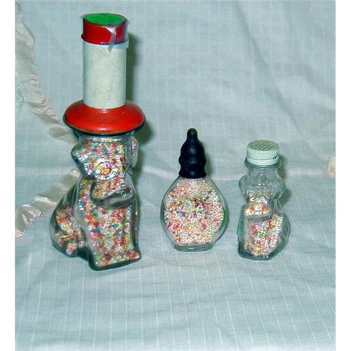 3 Sprinkle glass screw on candy holders/containers with caps. One large 6", 2 small 2.5". Two are dogs and one is a baby bottle with brown nipple. All have labels from companies in Pennsylvania. Large dog has a tin hat brim -probably has some design missing on top and is white. They still have the candy inside. Buyer pays shipping and handling costs.