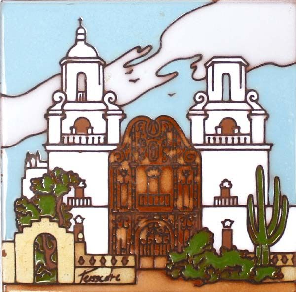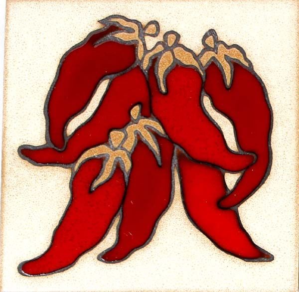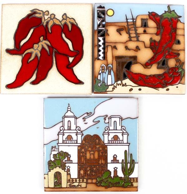 3 Glazed Ceramic Pottery Tile Trivets, measure 6'' square, includes 1. Teissedre Designs, Inc. San Xavier del Bac Mission Tile (chip on side) 2. Earthtones Pueblo Tile (chip on the bottom) 3. Singletree Chile Peppers Tile