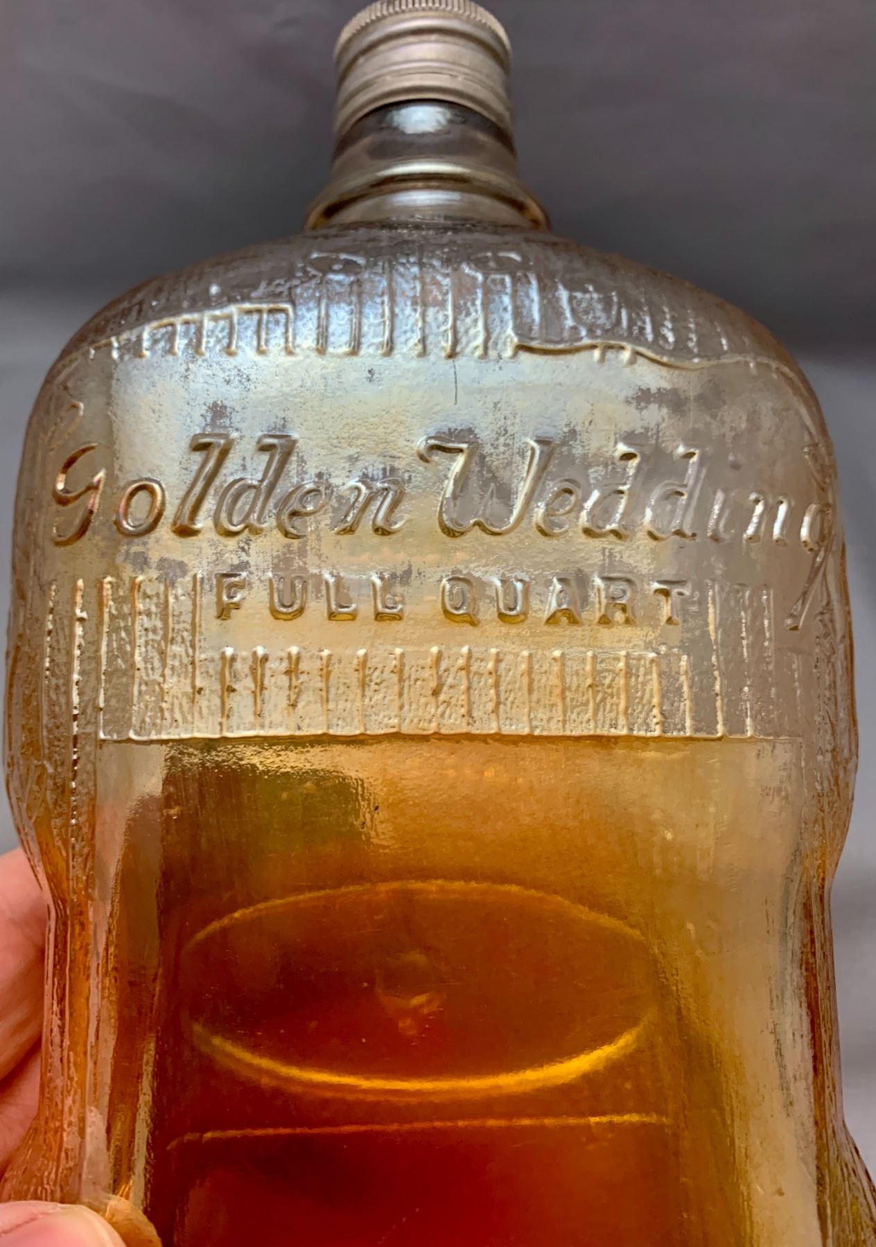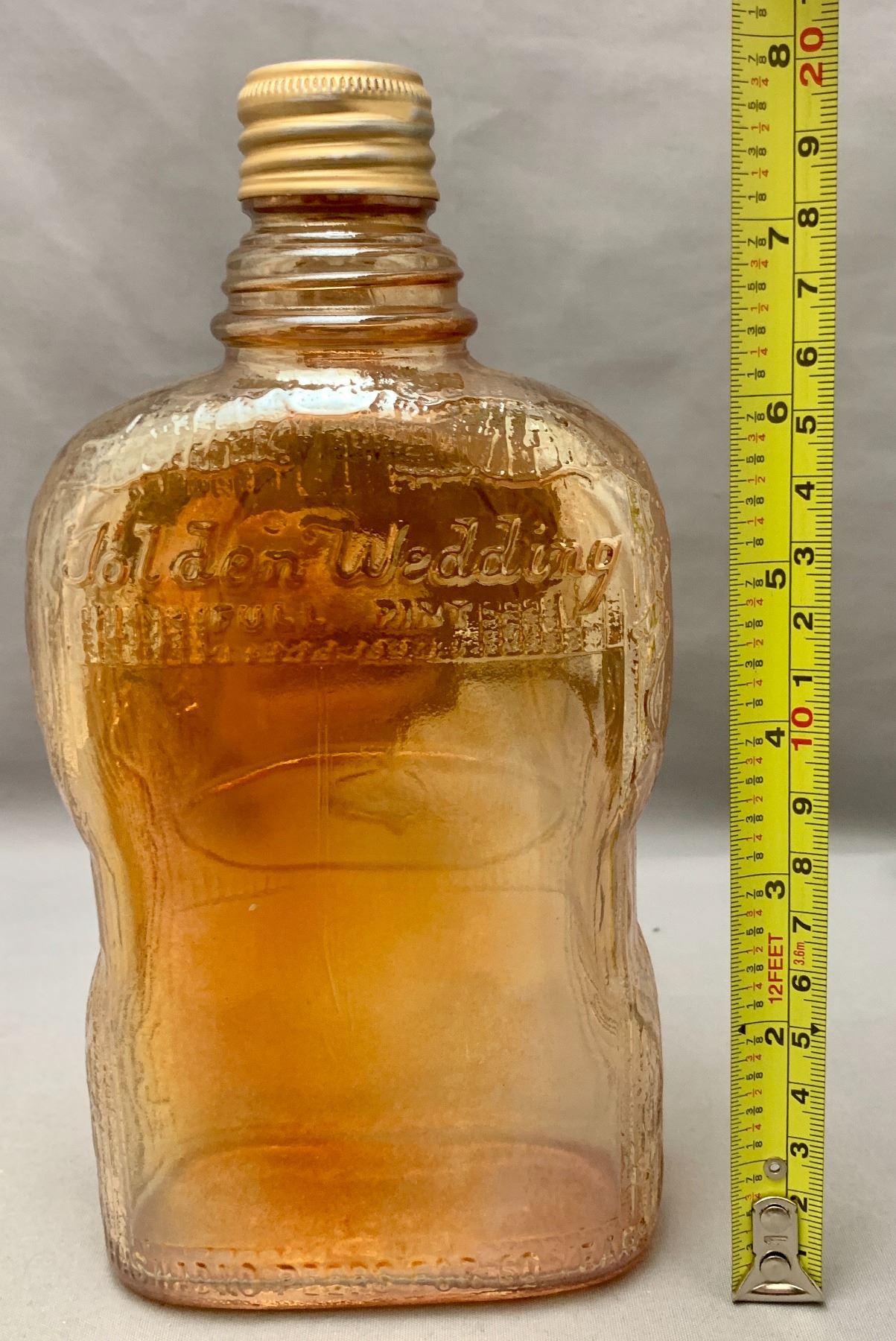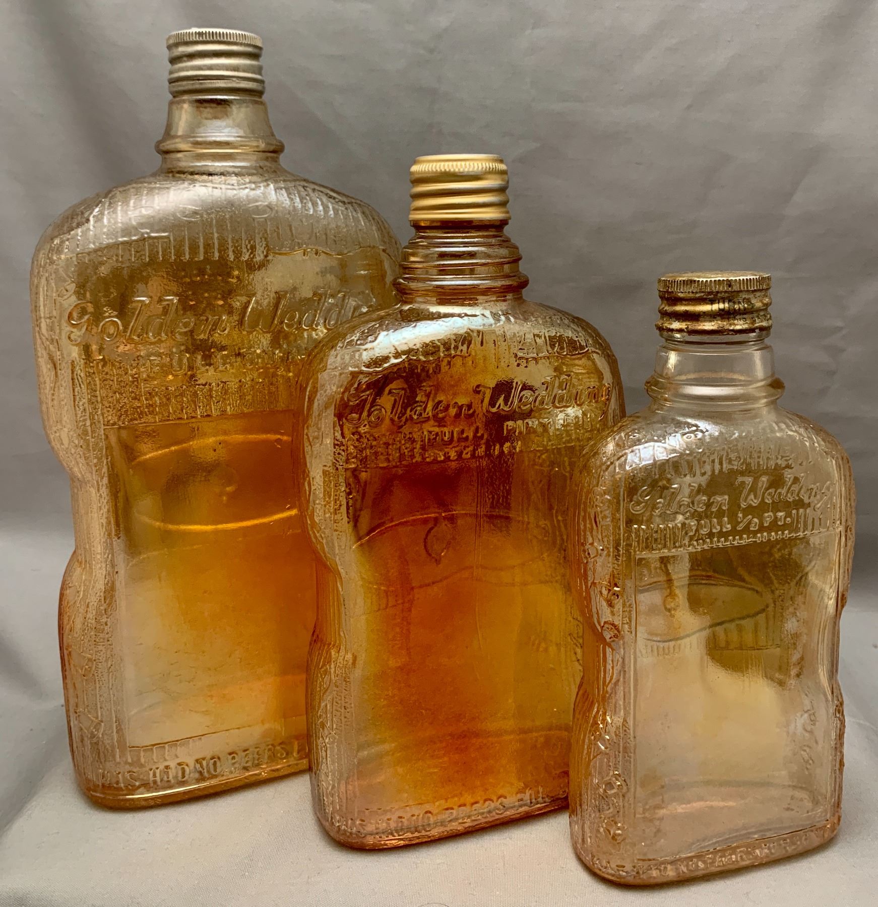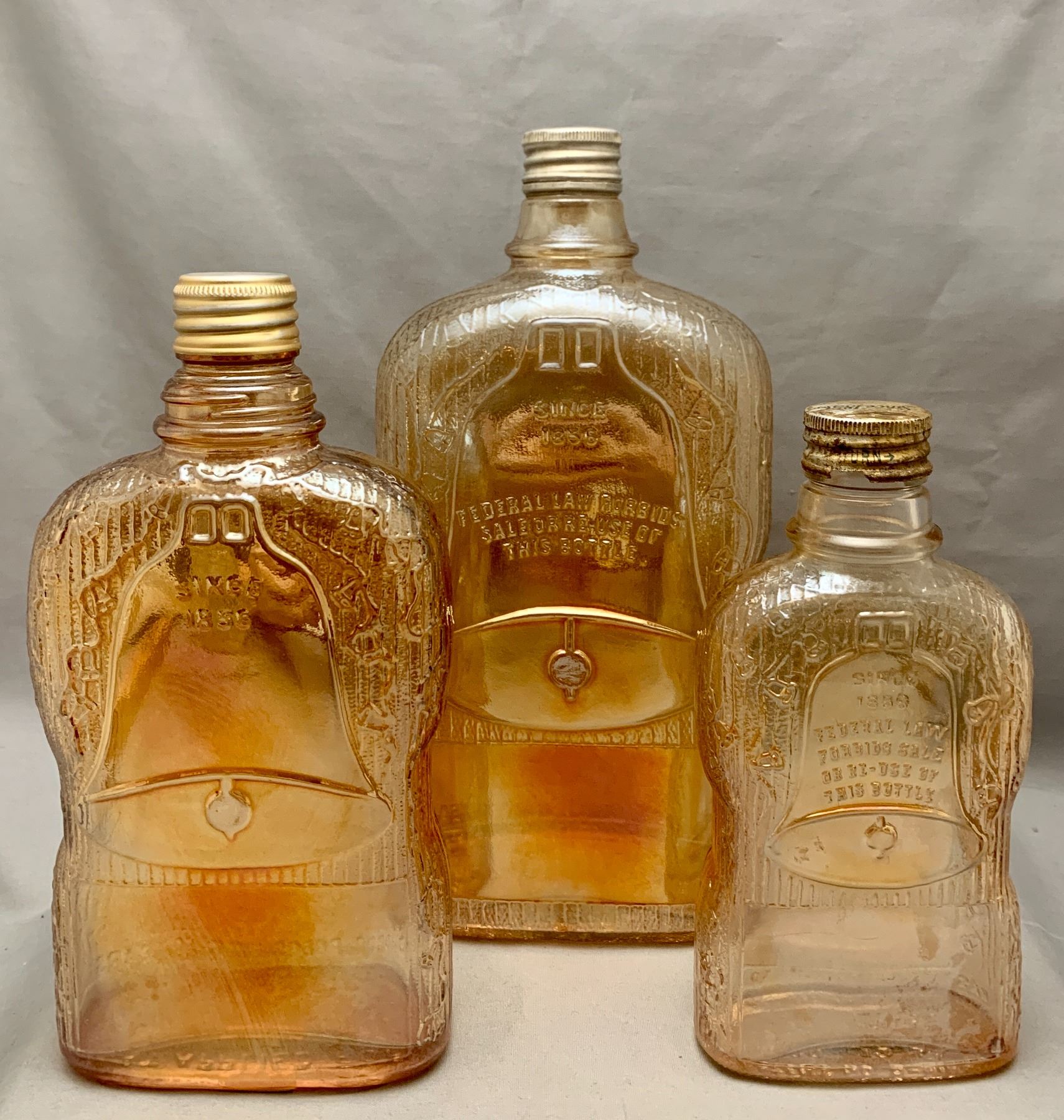 (3) "Golden Wedding" Carnival Glass Whiskey Bottles: 1 QT; 1 Pint; 1/2 Pint. RARE! Circa 1930's