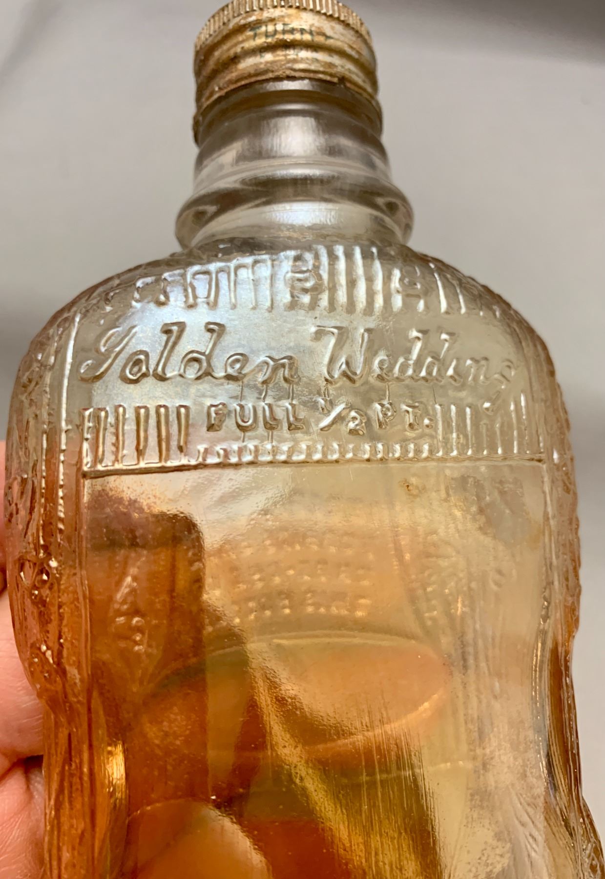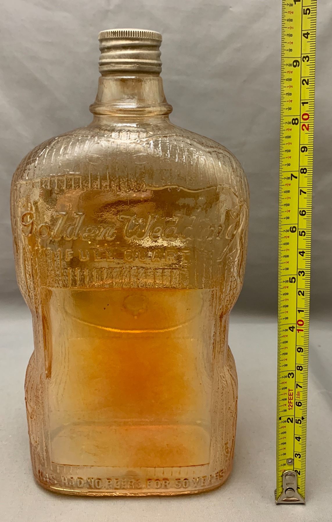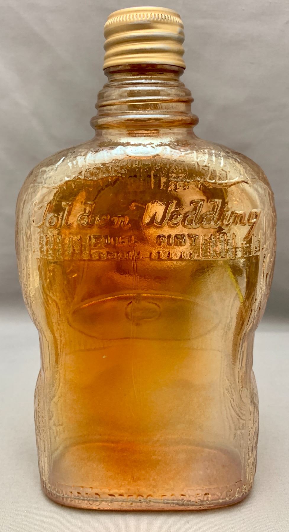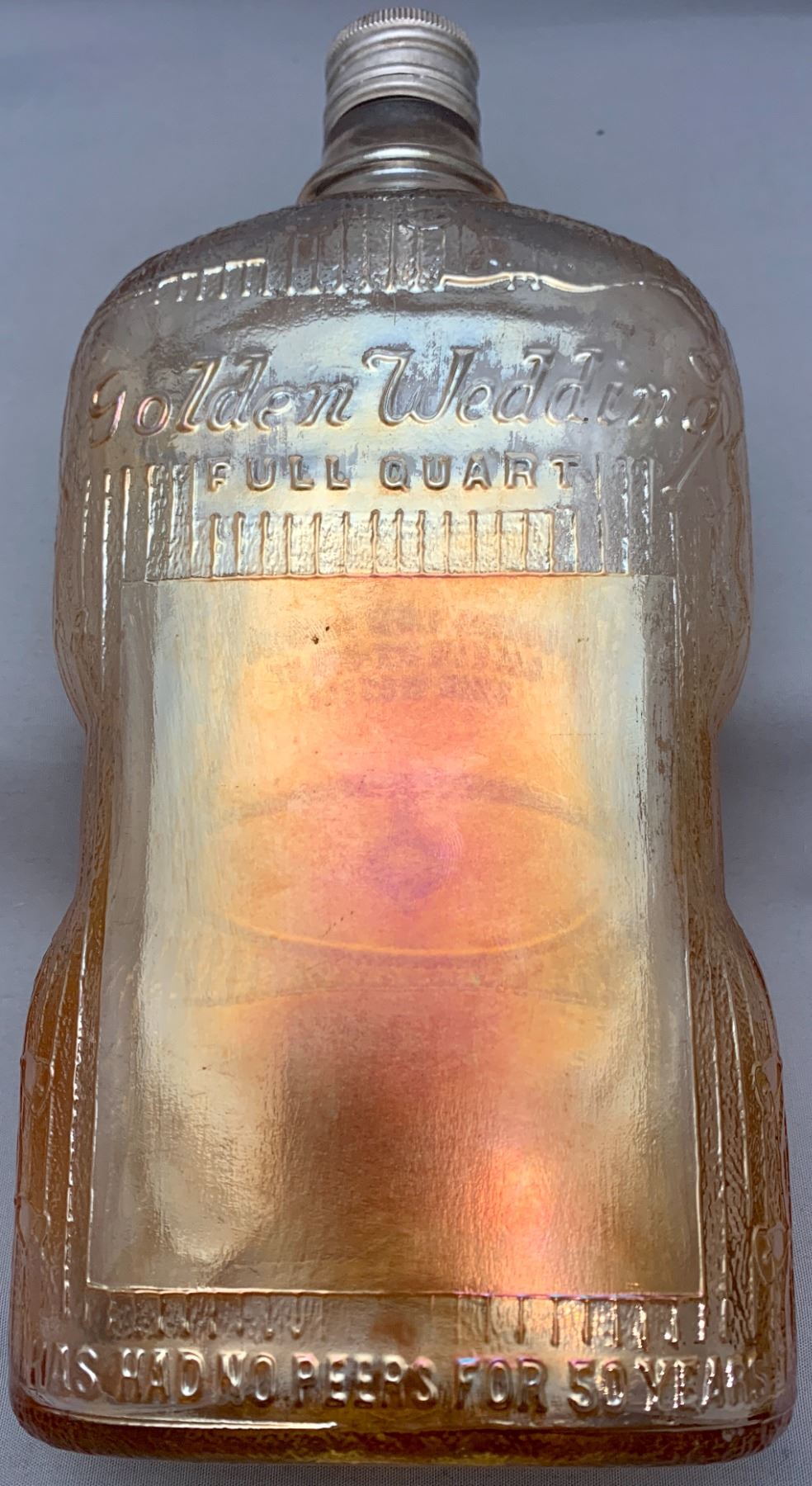 (3) "Golden Wedding" Carnival Glass Whiskey Bottles: 1 QT; 1 Pint; 1/2 Pint. RARE! Circa 1930's