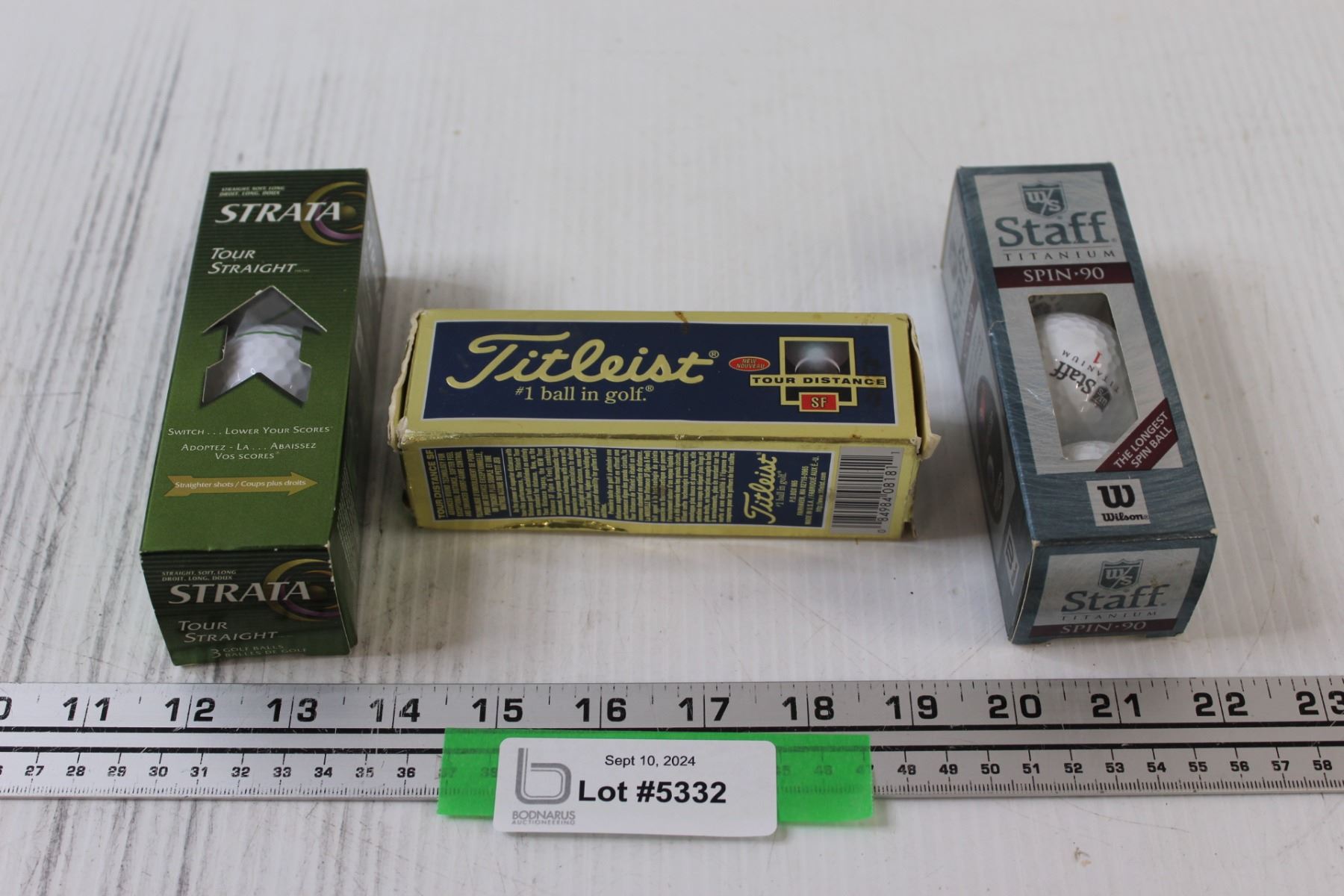 (3) Golf Ball Packages of Three Each (Strata, Titleist, Staff)