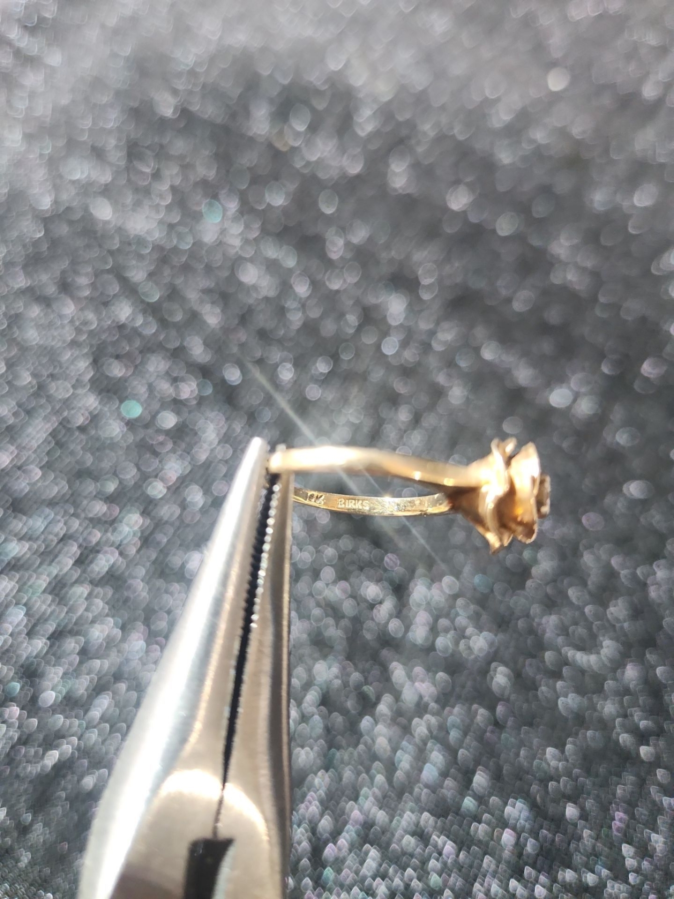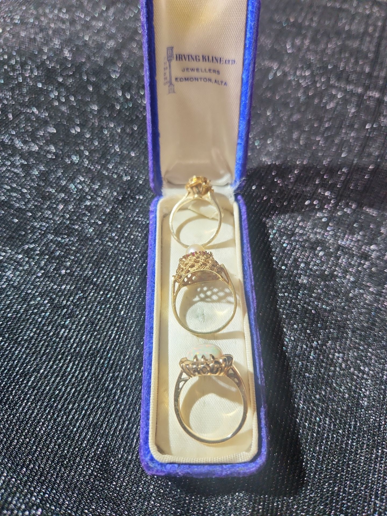 3 gold rings with different stone sets. One appears to have an Opal style centre, one with a pearl centre and one gold rose with diamond appearance middle.