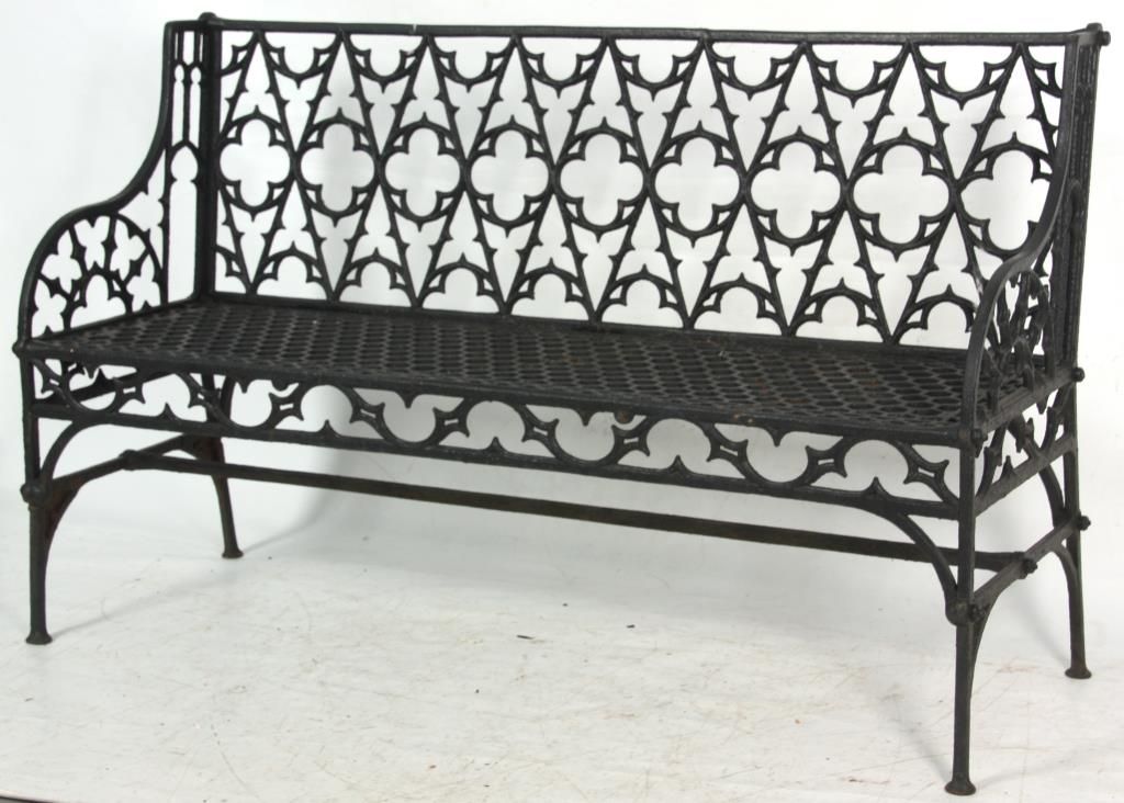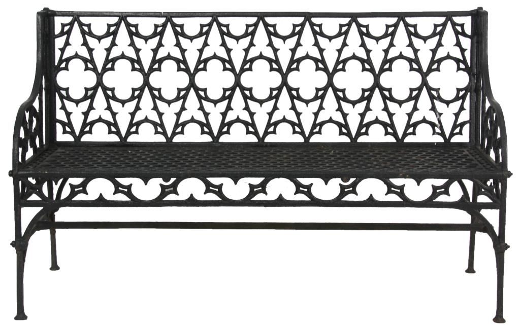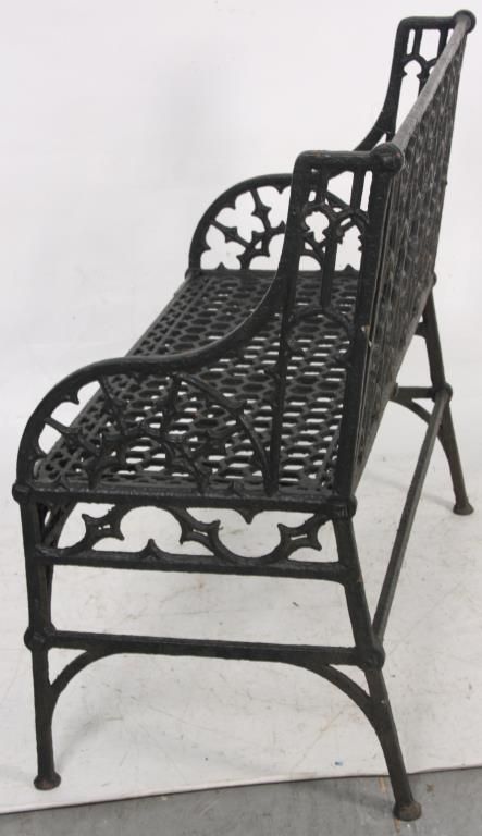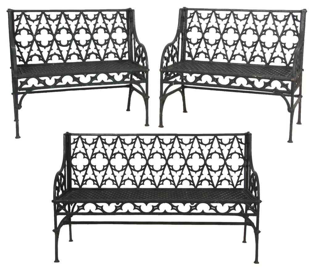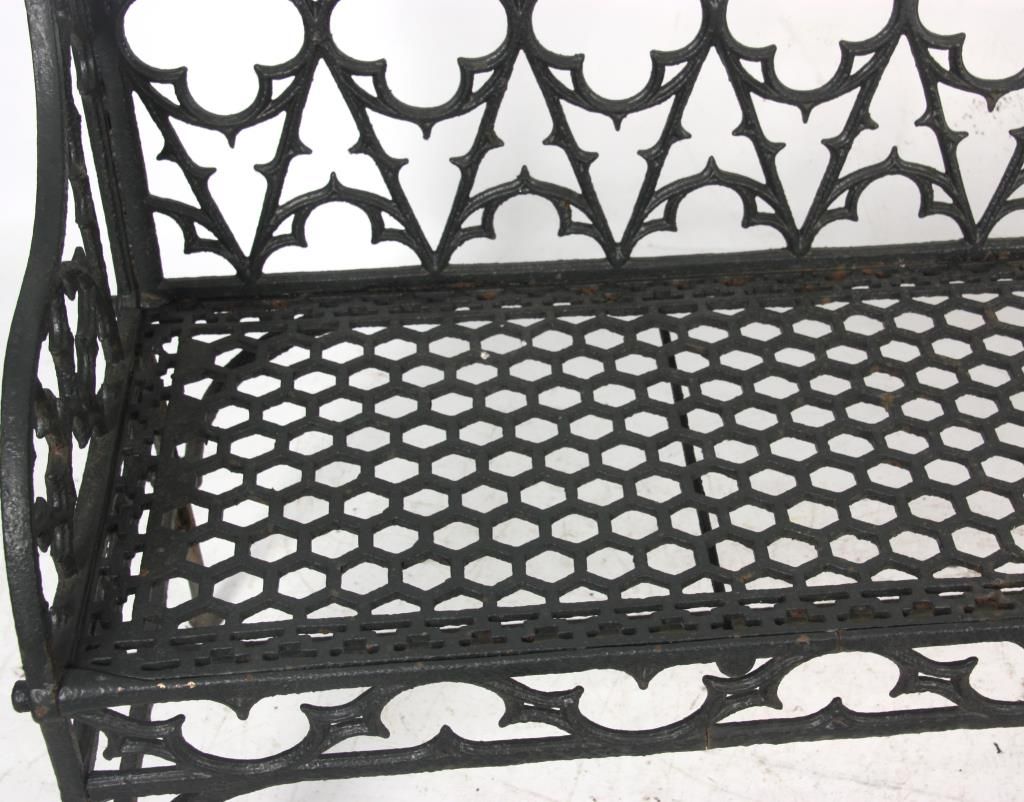 3 Gothic Iron Benches. One large bench and 2 smaller sized benches with gothic and quatrefoil shapes pierced decoration in the backs, seats, sides and seat rail, has arched arms, straight legs and hexagonal geometric pattern in the seat. 2 smaller benches: 35 in. high x 47 in. wide 21 in. deep - Larger bench: 36 in. high x 58 in. in. wide x 31 in. deep.