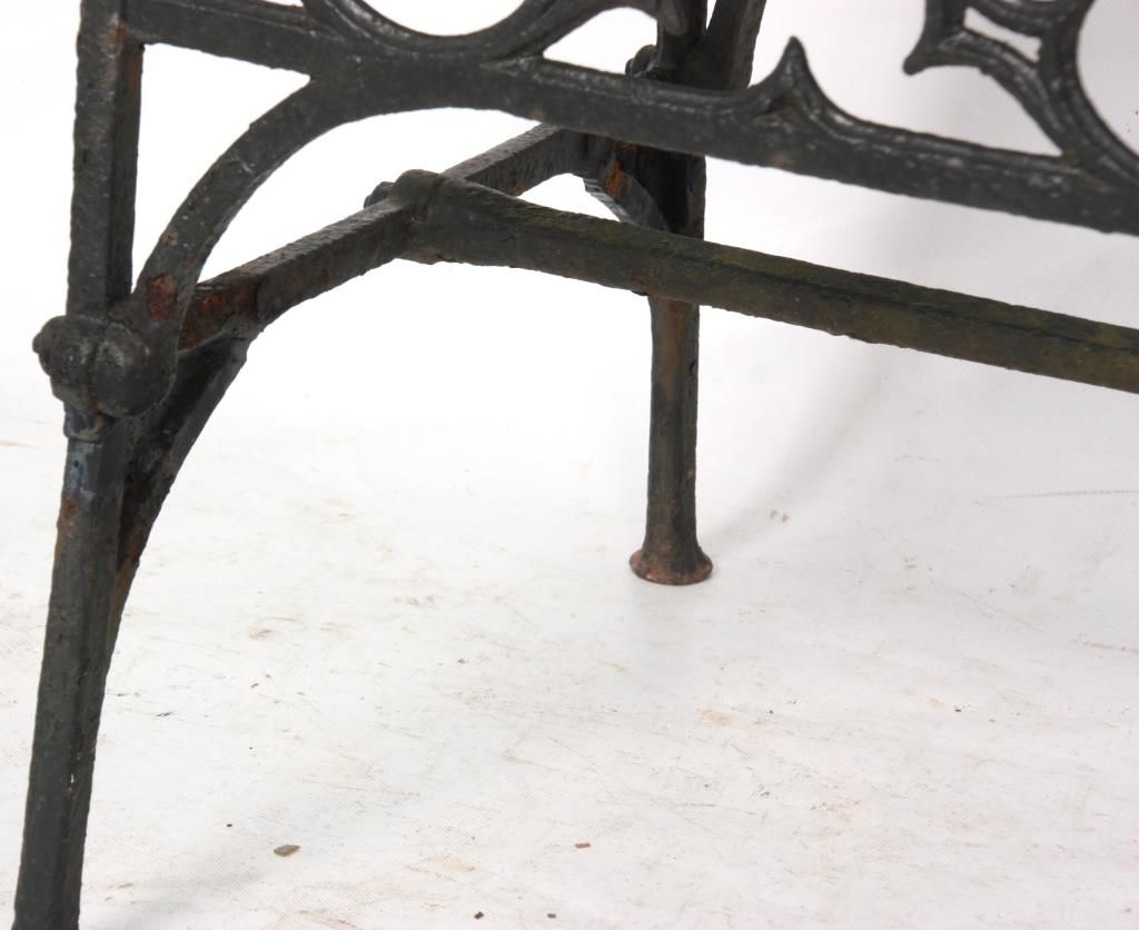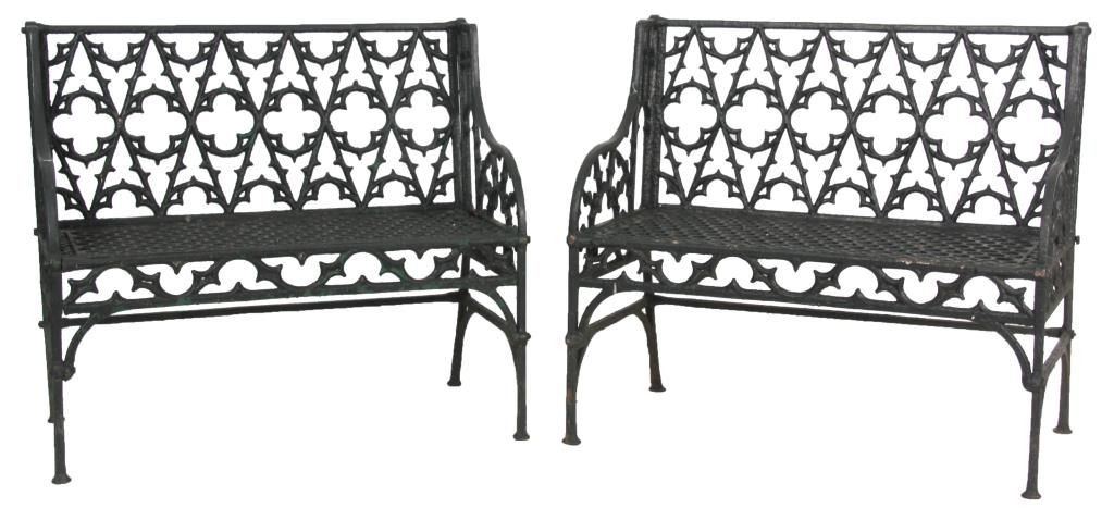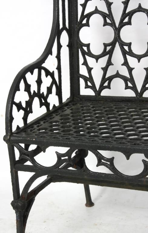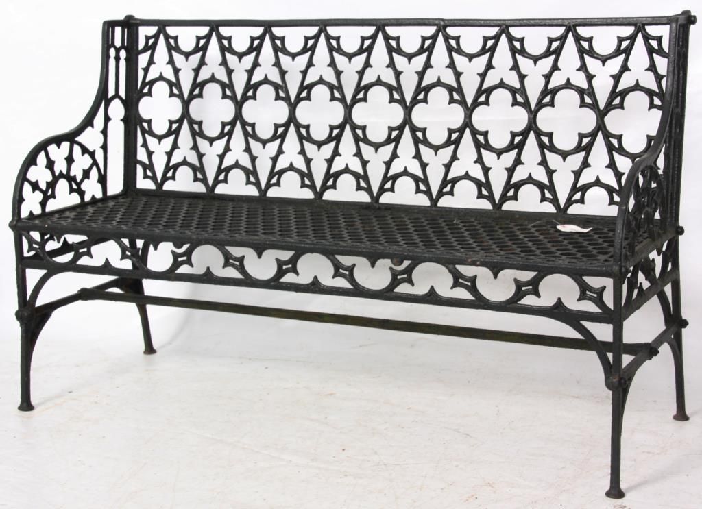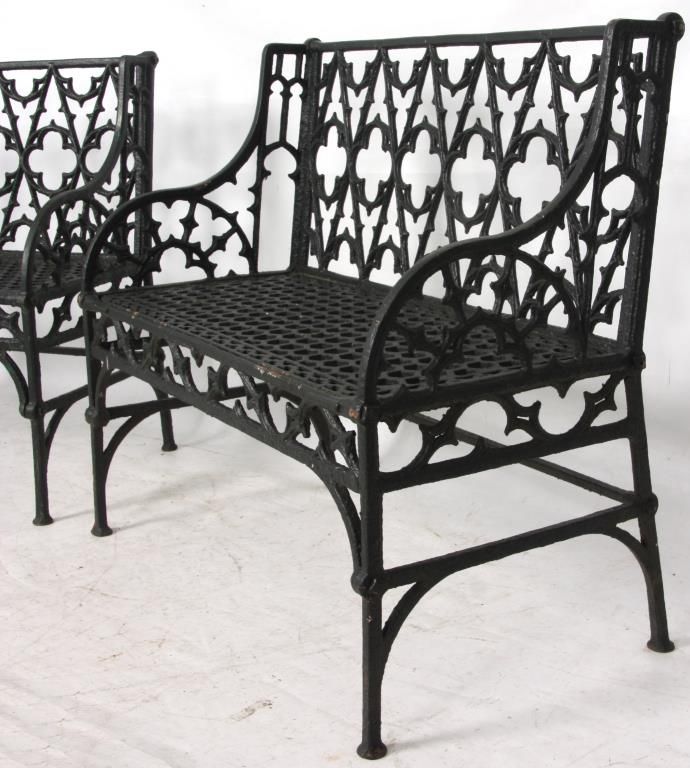 3 Gothic Iron Benches. One large bench and 2 smaller sized benches with gothic and quatrefoil shapes pierced decoration in the backs, seats, sides and seat rail, has arched arms, straight legs and hexagonal geometric pattern in the seat. 2 smaller benches: 35 in. high x 47 in. wide 21 in. deep - Larger bench: 36 in. high x 58 in. in. wide x 31 in. deep.