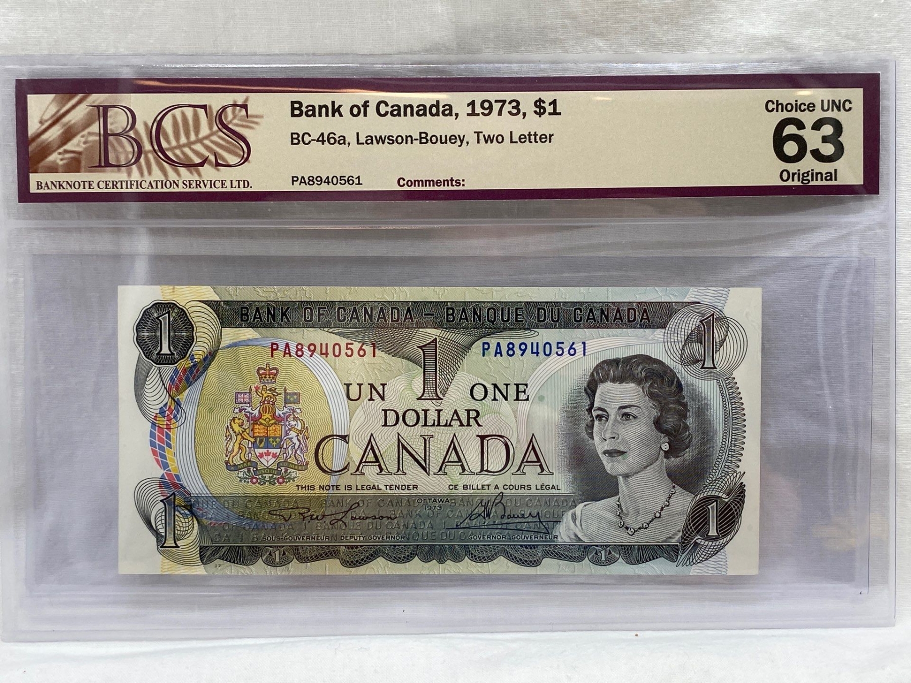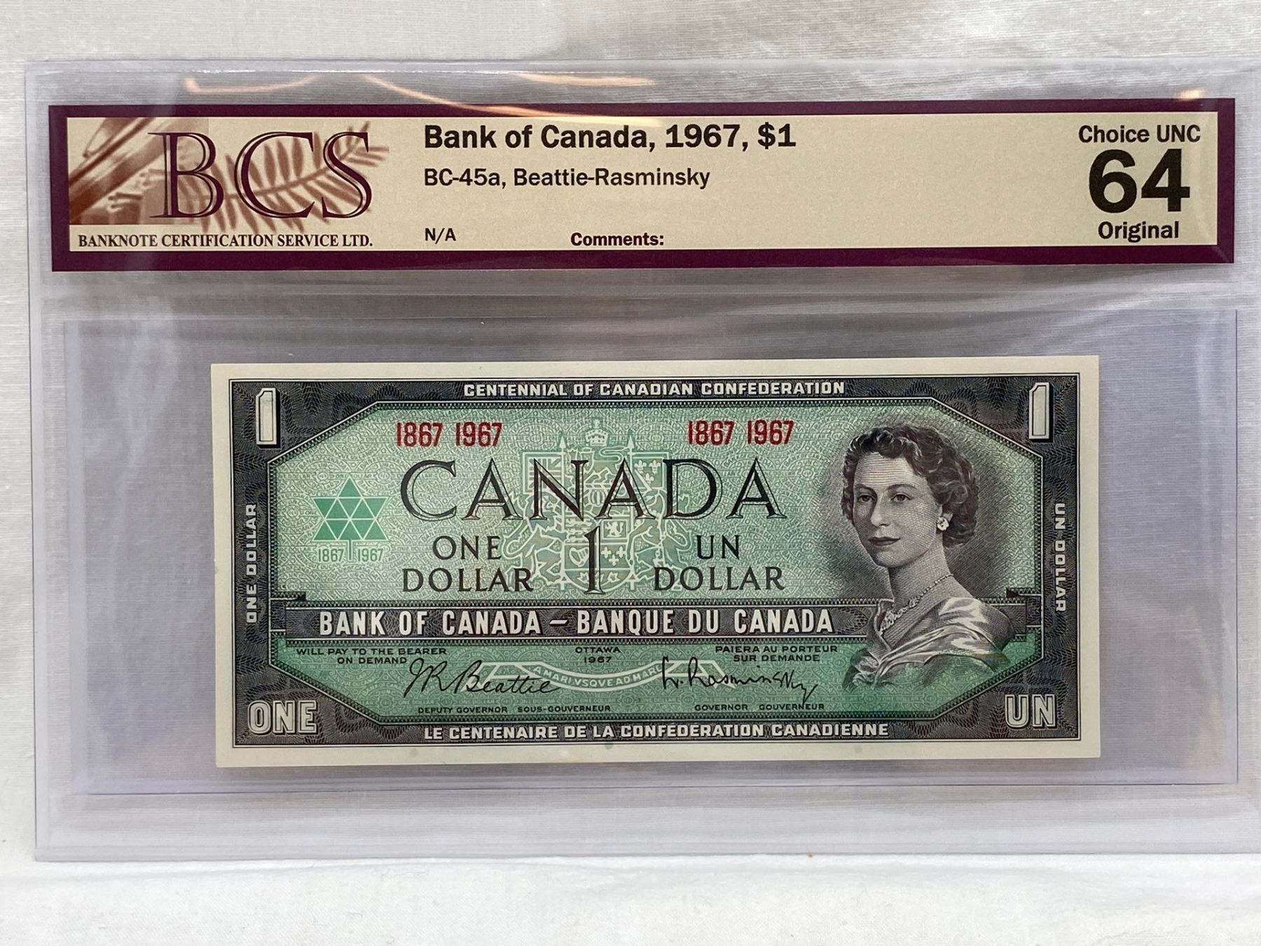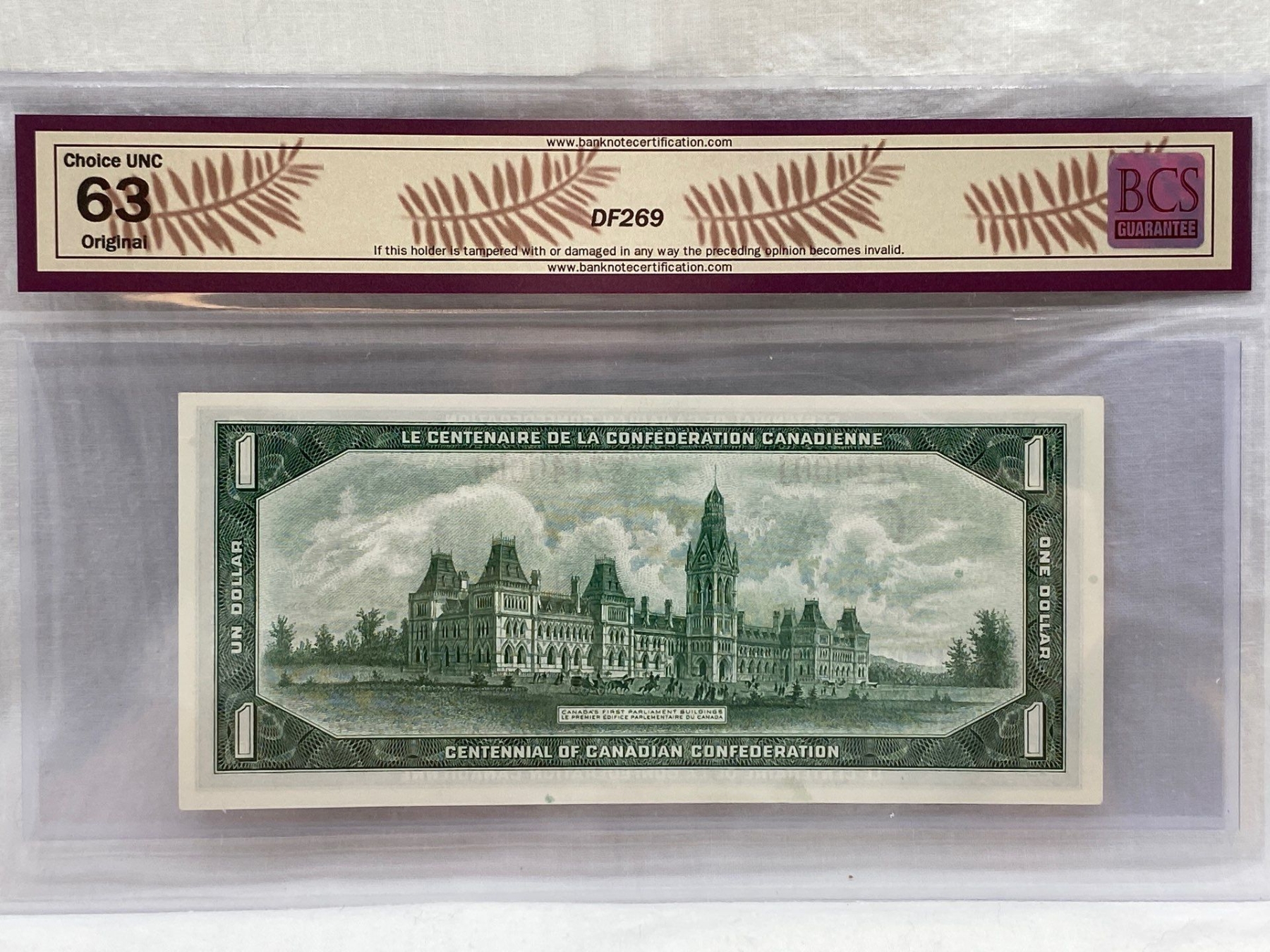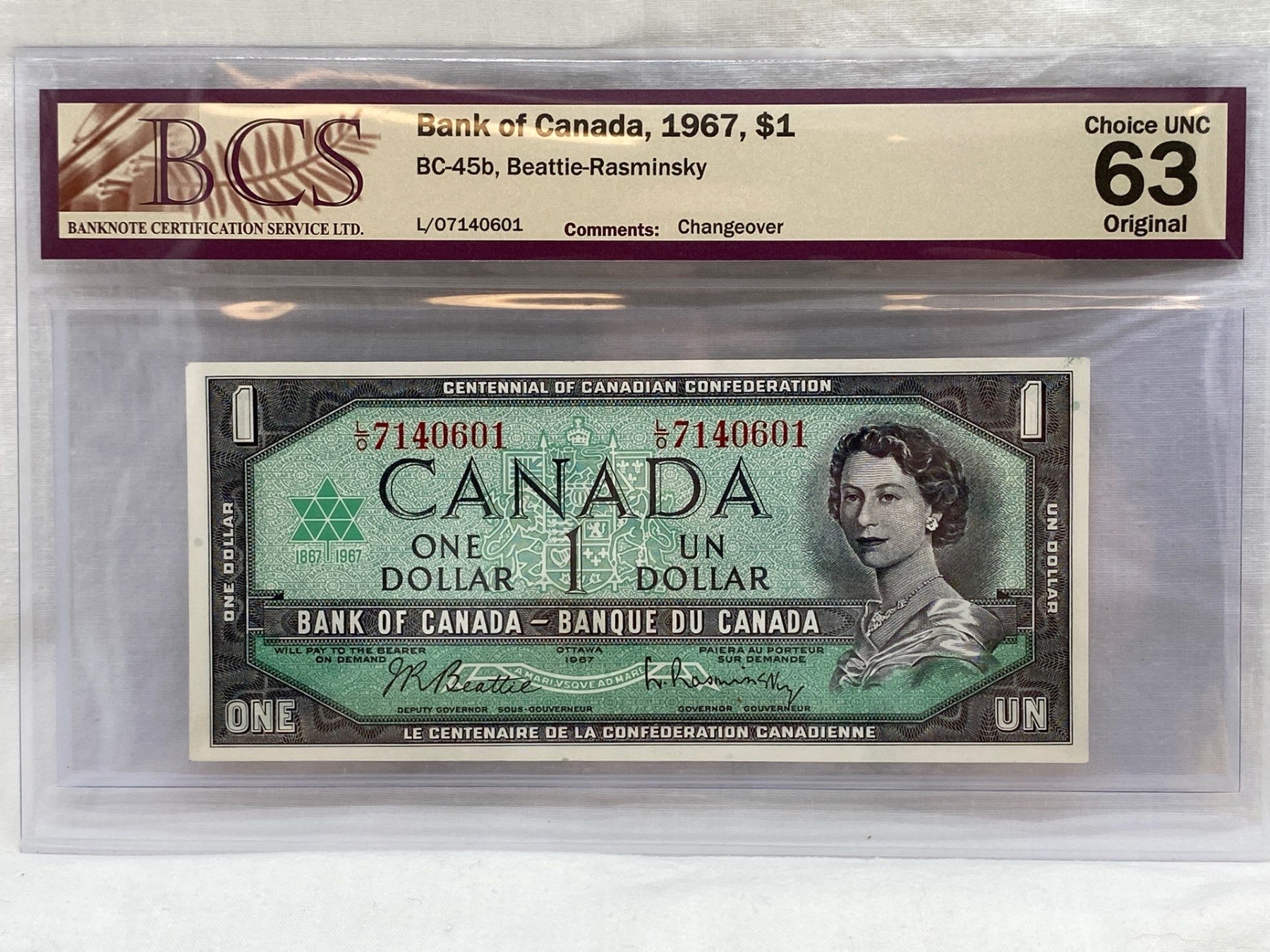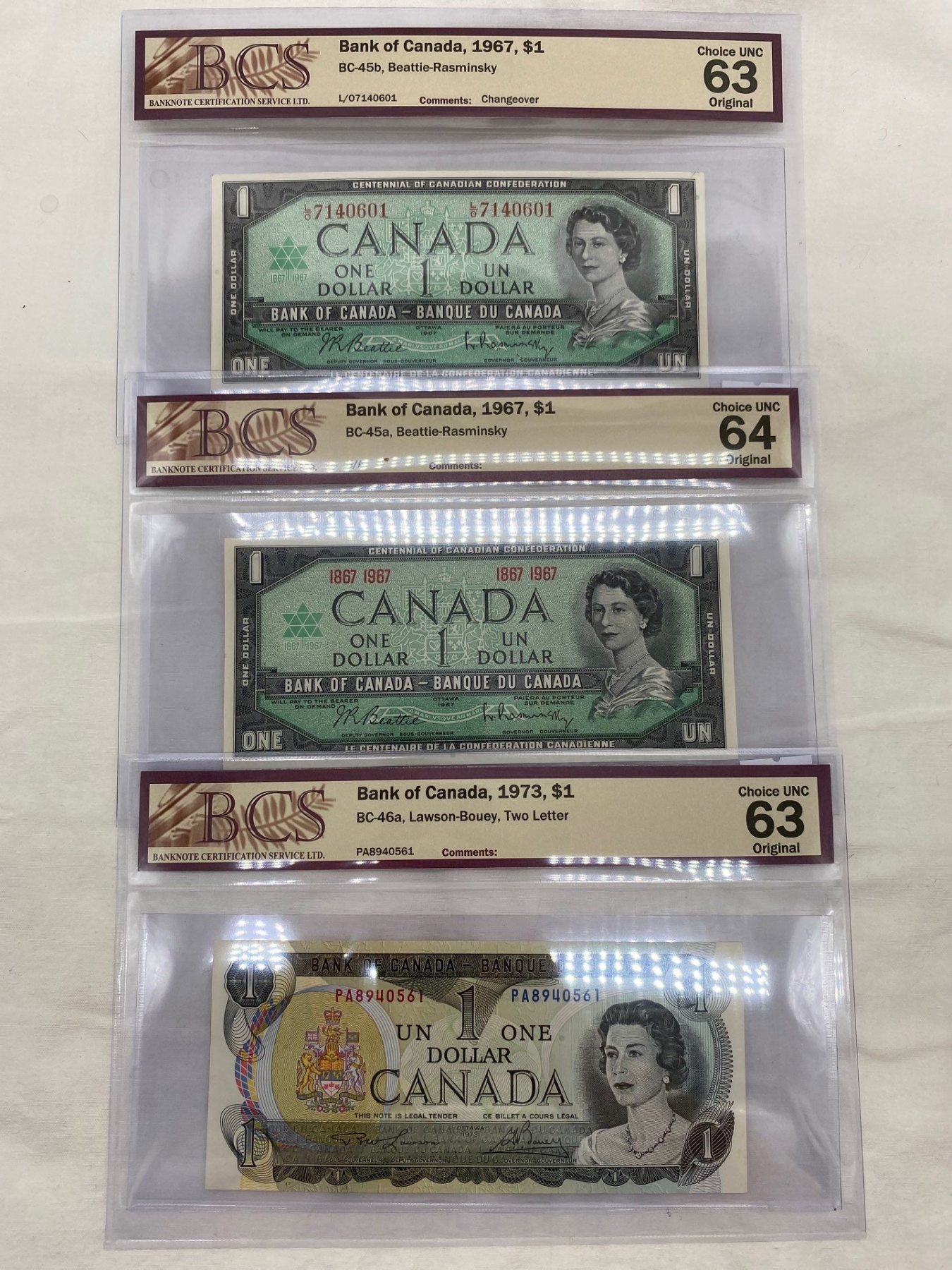 3 Graded Canadian $1 1967 and 1973 Choice UNC Prefix: L/O 1867 - 1967 PA