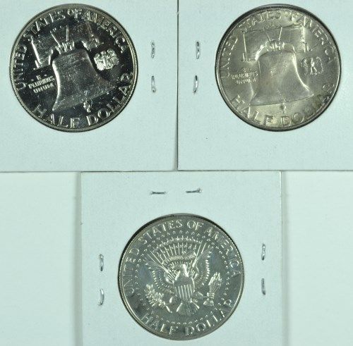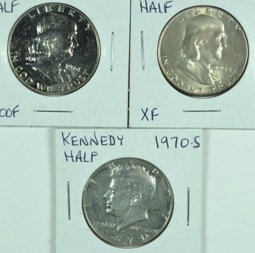 3 HALF DOLLARS 1954-S XF, 1961 PROOF, 1970-S PROOF)