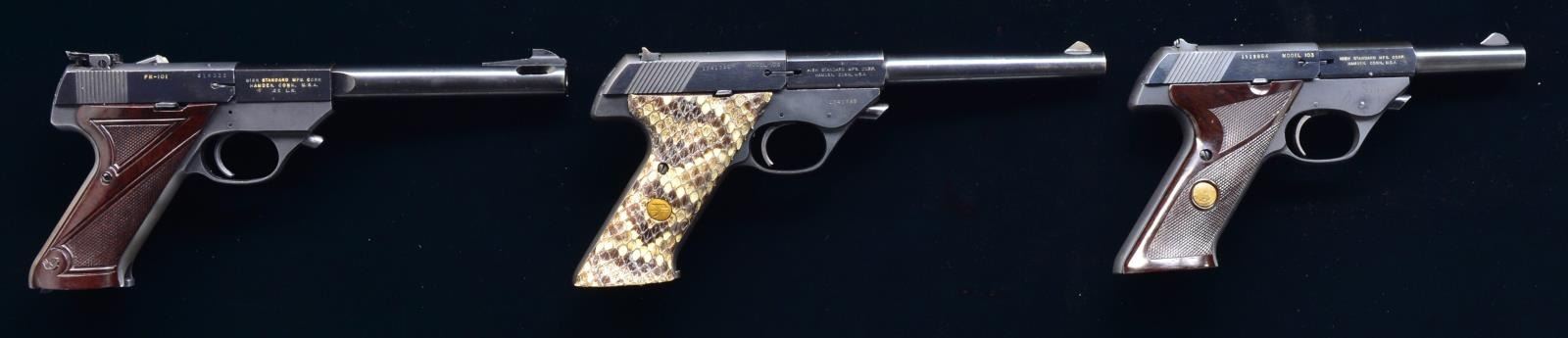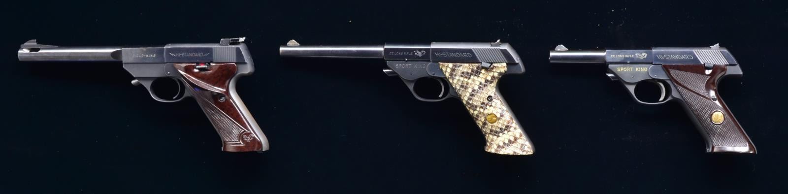 ALL: cal. 22 LR. 1) 101 SPORT KING. S# 1519864. Bbl. 4 1/2". Serrated ramp front sight w/ square notch rear sight having added white paint. Bbl. & frame markings have added Bonanza gold fill. 2 Piece checkered plastic grips. MAGS: 1 detachable 10 rd. CONDITION: over 90% blue showing edge wear. Grips show light wear & marks. Bright bore w/ strong rifling. (20-3696/DS). 2) FK-101 FIELD-KING. S# 618322. Bbl. 6 7/8" ported heavy. Ramp mounted blade front sight w/ square notch adj. rear sight. Rear sight has added black & white paint. Bbl. & slide markings retain some Bonanza gold finish. 2 Piece checkered plastic grips. MAGS: 1 detachable 10 rd. CONDITION: 70% metal finish showing wear on grip straps w/ edge wear & light scratches. Grips show light wear. Bore is bright w/ sound rifling. (20-3729/DS). 3) 103 SPORT KING. S# 1741745. Bbl. 6 7/8" w/ serrated ramp front sight & square notch rear sight. Rattlesnake scale pattern plastic grips. MAGS: 1 detachable 10 rd. CONDITION: 90% blue showing edge wear & scattered scratches. Bright bore w/ strong rifling. (20-3730/DS). ALL CURIO. $700-1,000.