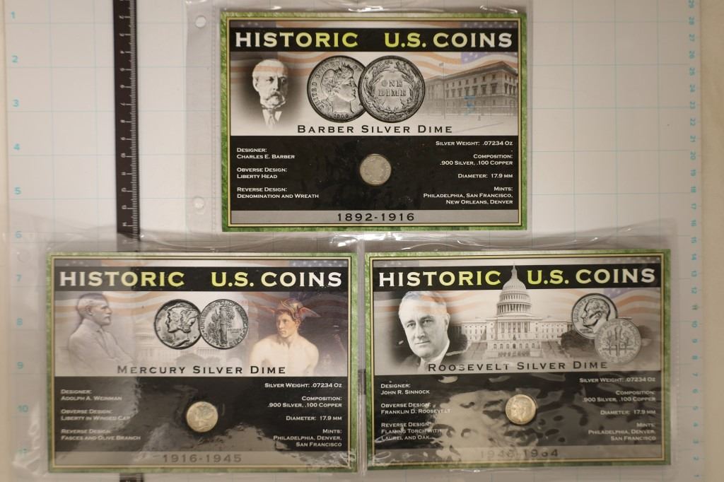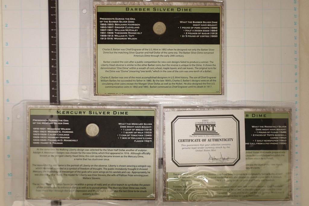 SLEEVE. 1911 SILVER BARBER DIME, 1939 SILVER MERCURY DIME AND 1961 SILVER ROOSEVELT DIME