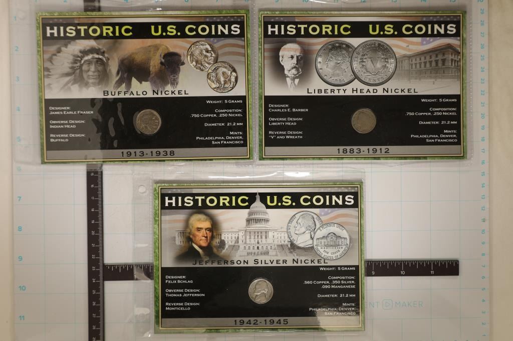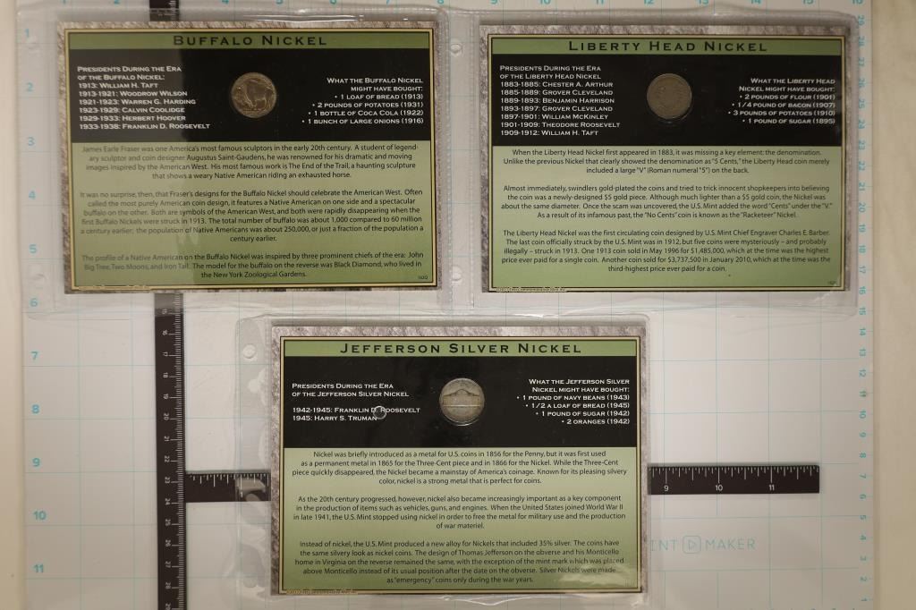 BUFFALO NICKEL AND 1943-P 35% SILVER JEFFERSON WAR NICKEL. ALL ARE MOUNTED IN CARDBOARD DISPLAY CARDS WITH INFO ABOUT EACH DESIGN WITH PLASTICS SLEEVES OF THEIR OWN.