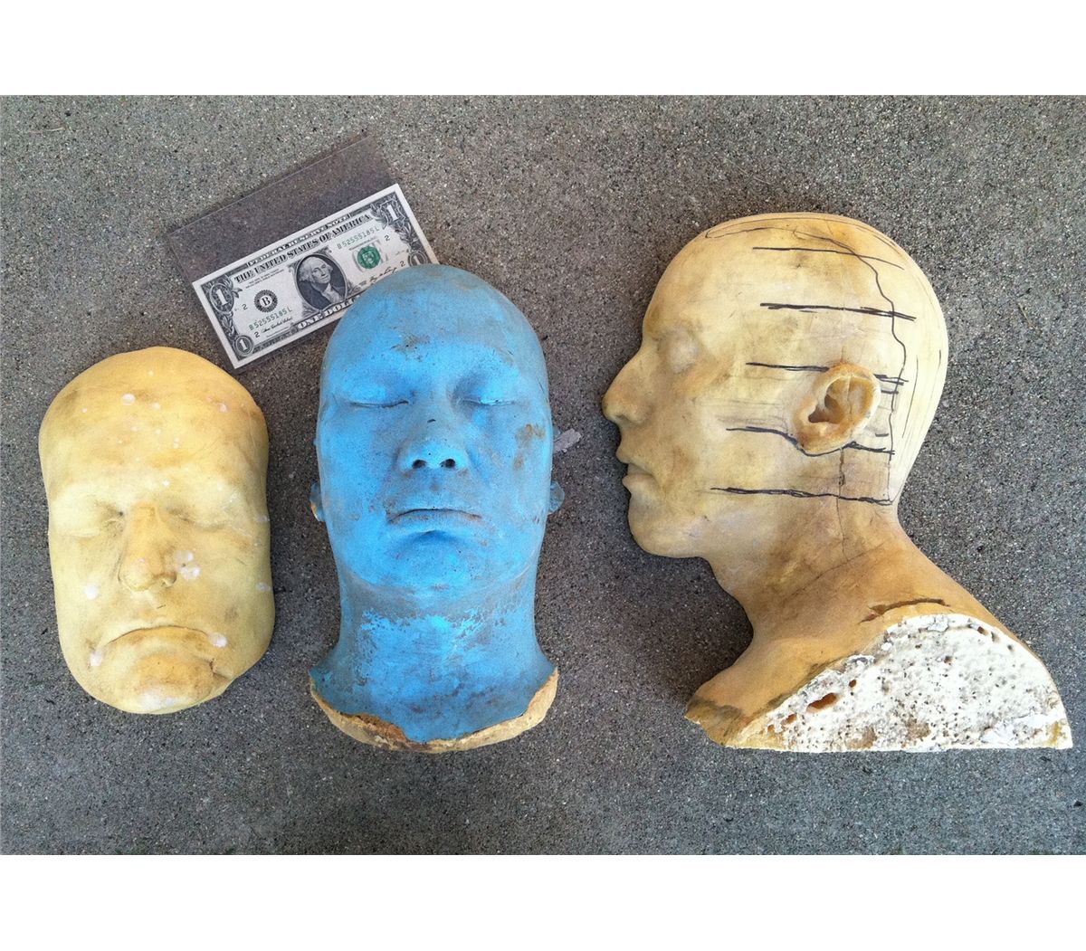 This is a collection of 3 human face castings. They are made of rigid foam and the blue one seems to have a thin silicone skin. I believe the one to the left may be Robin Williams.