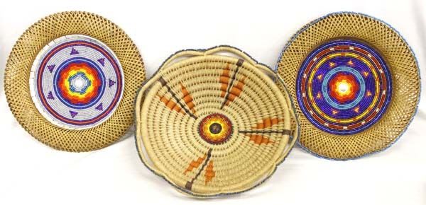 3 Hand Beaded Baskets by Kathy Kills Thunder, beautifully beaded with stone and mother of pearl embellishments, largest measures 4'' x 14''D, gorgeous colors, Artist Bio: Kathleen Kills Thunder (her legal name) was born in 1947 in Seattle, WA. Her father, Ben Kills Thunder, was a Sioux Indian from the Fort Peck Indian Reservation in NE Montana and her mother was Spanish/Irish. Kathy has been painting and beading since she was six.