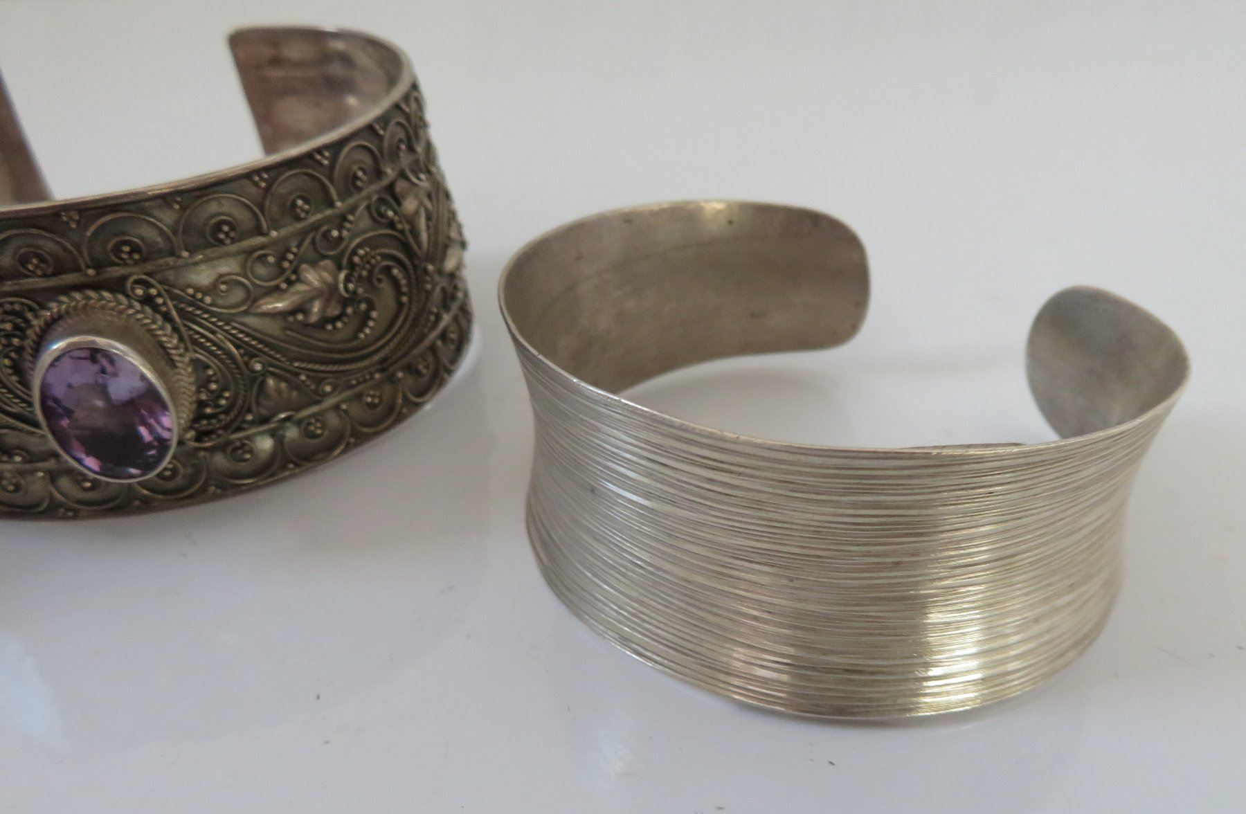 3 Handmade Cuff Bracelets, antique items. Made of sterling silver and aquamarine, the 2 Burmese cuffs measure 7" and 6" inside with a 1" opening, other European item measures 7" with a 1" opening. Condition: Good, some patina and some corrosion, see images. Shipping: $18.50 w/insurance and signature.