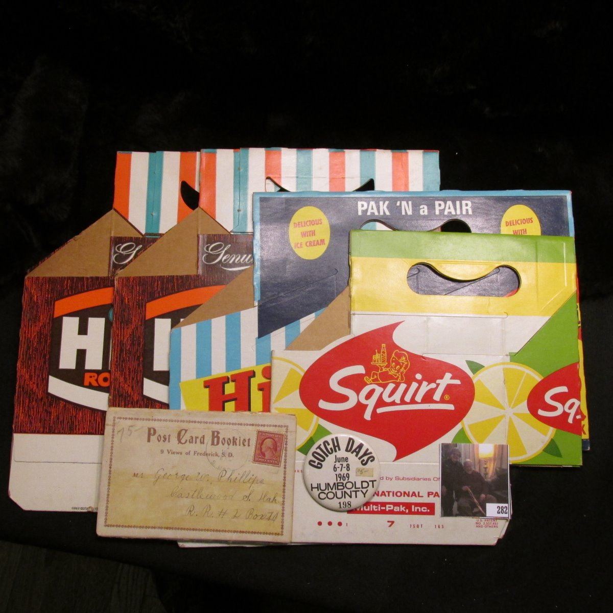 (3) Hires Root Beer Six Pack Cartons (2 varieities) & a Squirt Six Pack Carton, all appear unused; 1969 Humboldt County "Gotch Days" Pin-back; & a 1909 Postmarked Post Card Booklet with 9 views of Frederick, S.D.