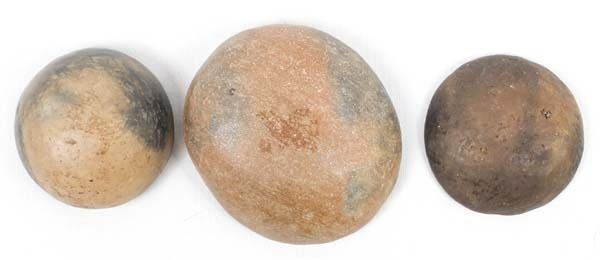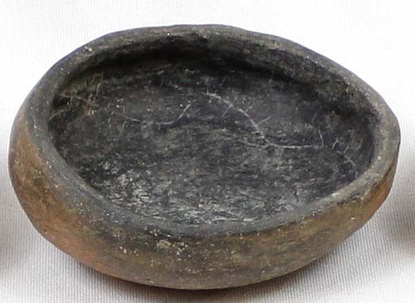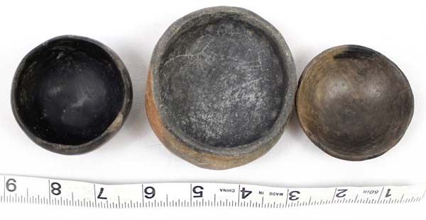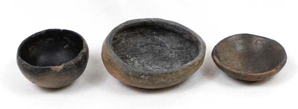 3 Historic Native American Taos Micaceous Clay Pottery Bowls, largest measures 3.5''L x 2 7/8'' x 1.5''H, the medium size bowl has chips in the rim