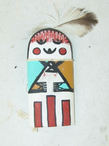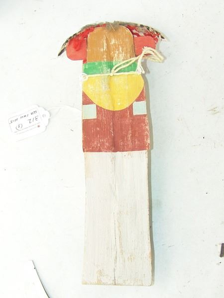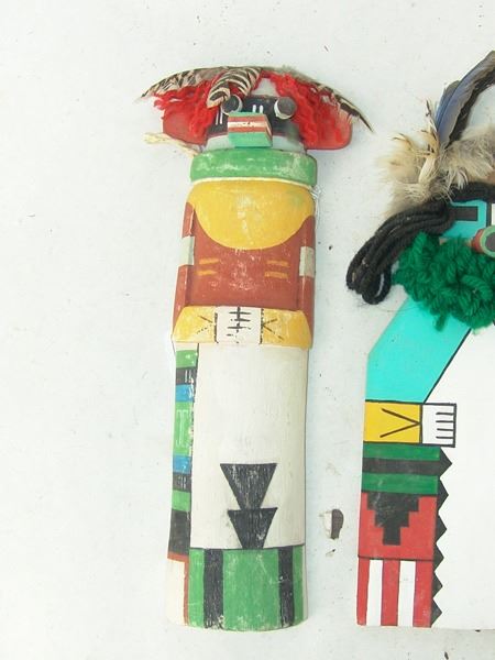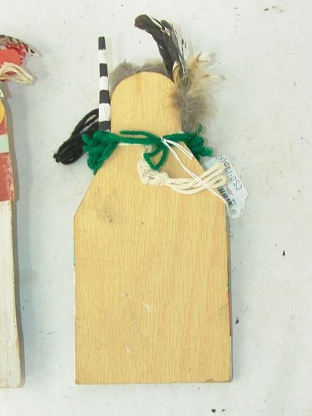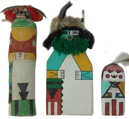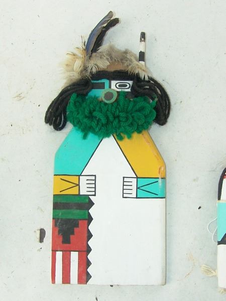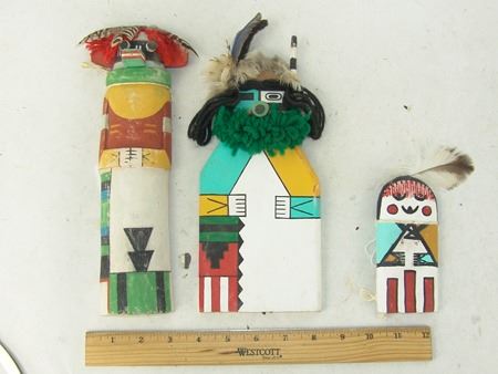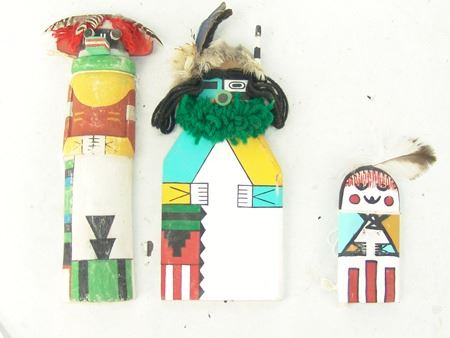 Late 1900s, Collection of three hand carved and painted (two of cottonwood root) flat backed dolls, sometimes called "crib" dolls. Good to very good condition. 10-1/2"