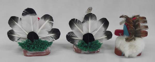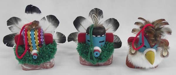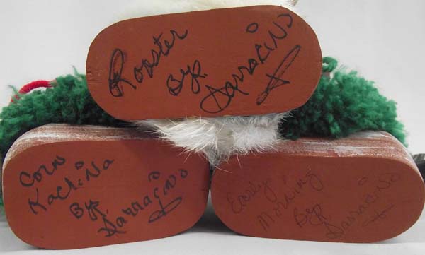 3 Hopi Hanging Kachinas. Native American Hopi wood carver, Raphael Sarracino known to his friends as Silent Warrior, has won countless awards including outstanding Craftsman for Indian Arts an honor bestowed by the Governors of Arizona and New Mexico. These three outstanding katchinas each measure approx. 6 inches and are signed on the bottom, Corn Kachina, Rooster and Early Morning with artist signature. Buyers Pay Actual Shipping and Handling Charges(see terms and conditions for more information).