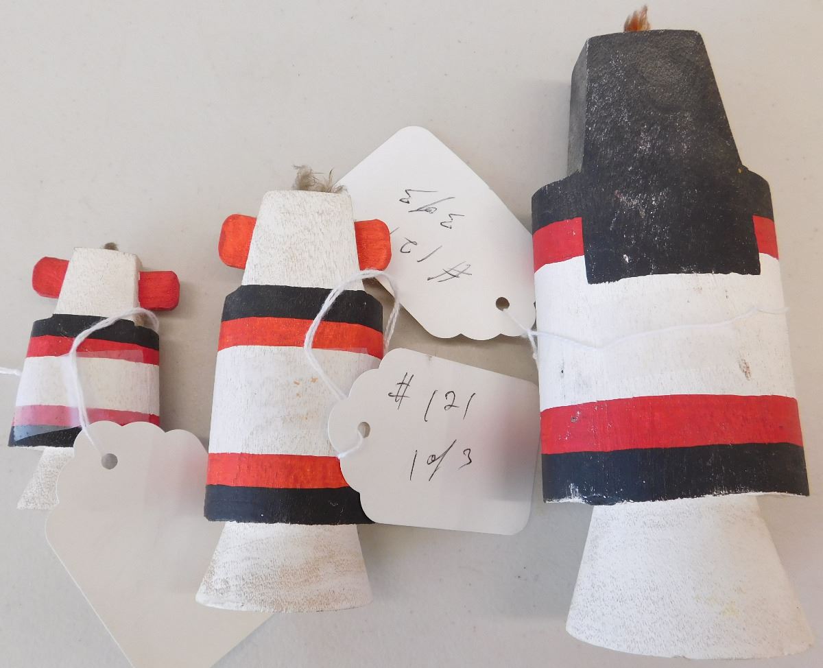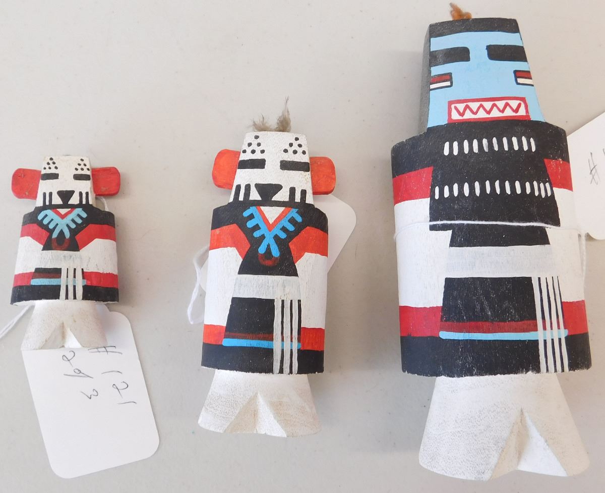 3 Hopi Kachinas, circa 1930s-40s. Made of cottonwood and paint, these items measures 6", 4" and 2.5" tall. Hopi, North-Central Arizona. 3 nice Route 66 kachina dolls. Condition: Very good, see images. Shipping: $20.50.