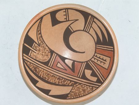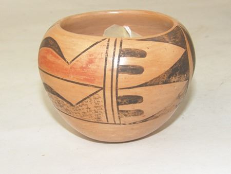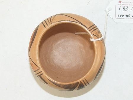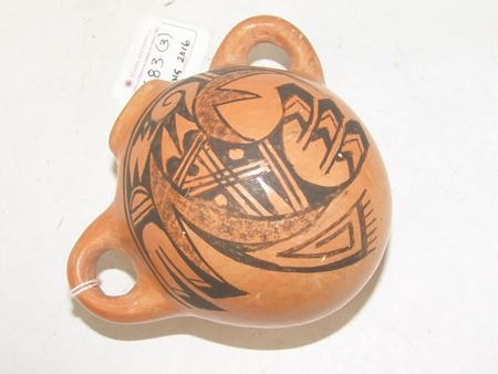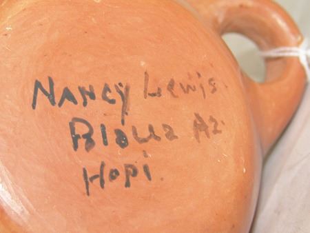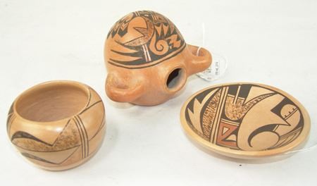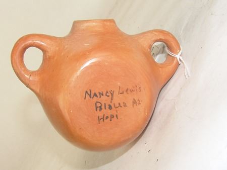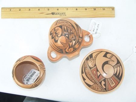Mid/Late 1900s, Including a vintage canteen by Nancy Lewis (with repaired handle) and a small dish and jar by Becky Namoki. Both in very good condition. 1-1/4" x 4-5/8" to 3-1/2" x 5" x 4"