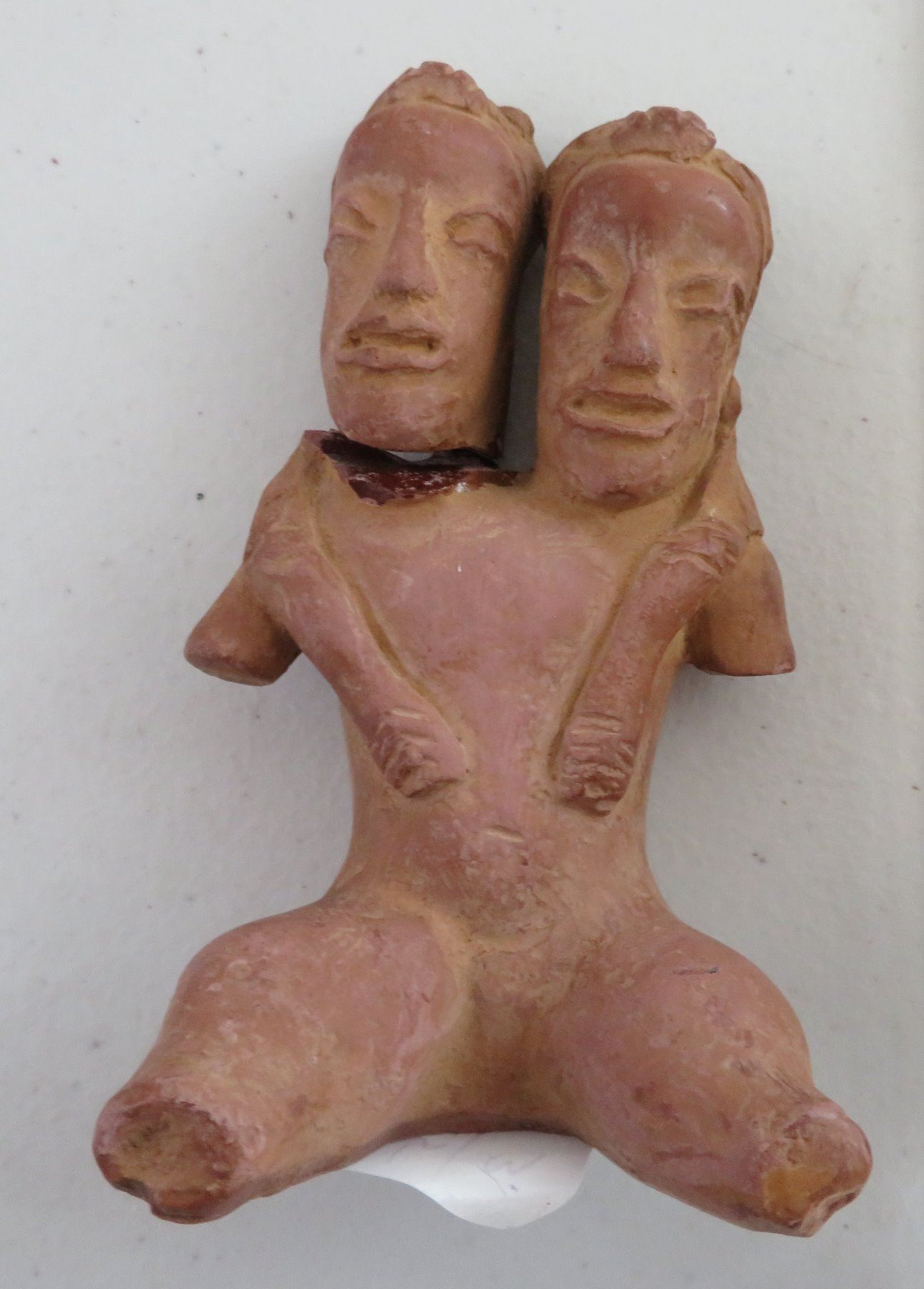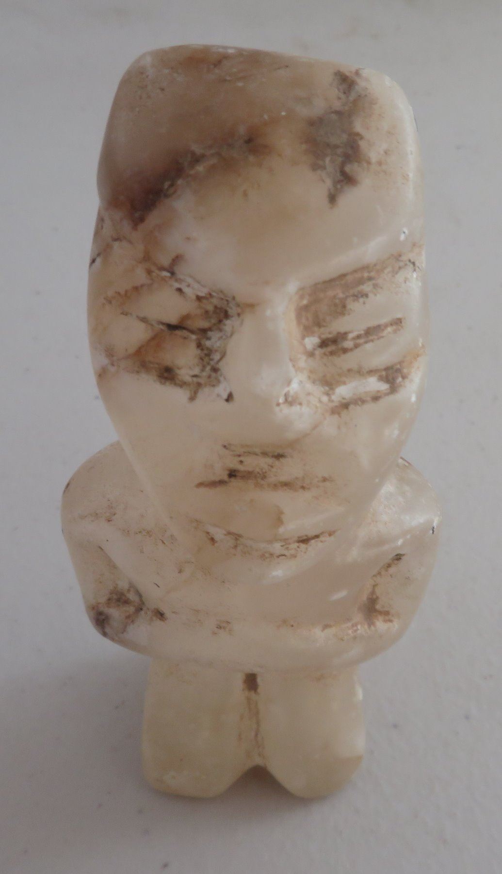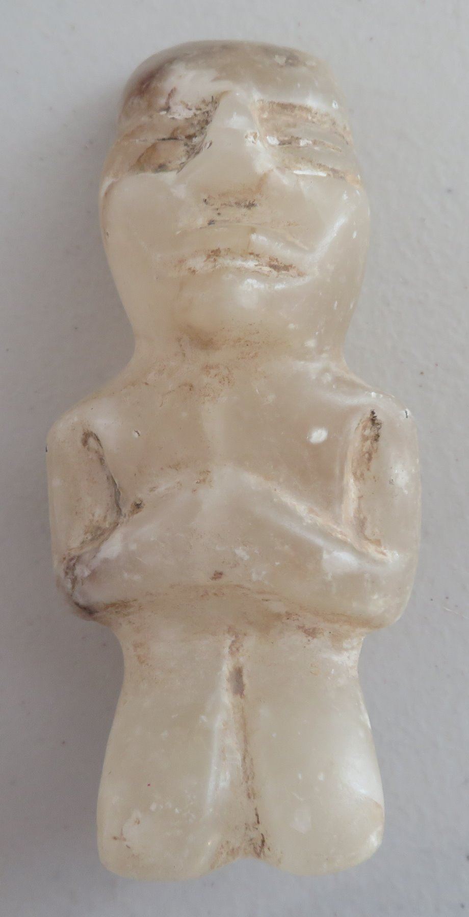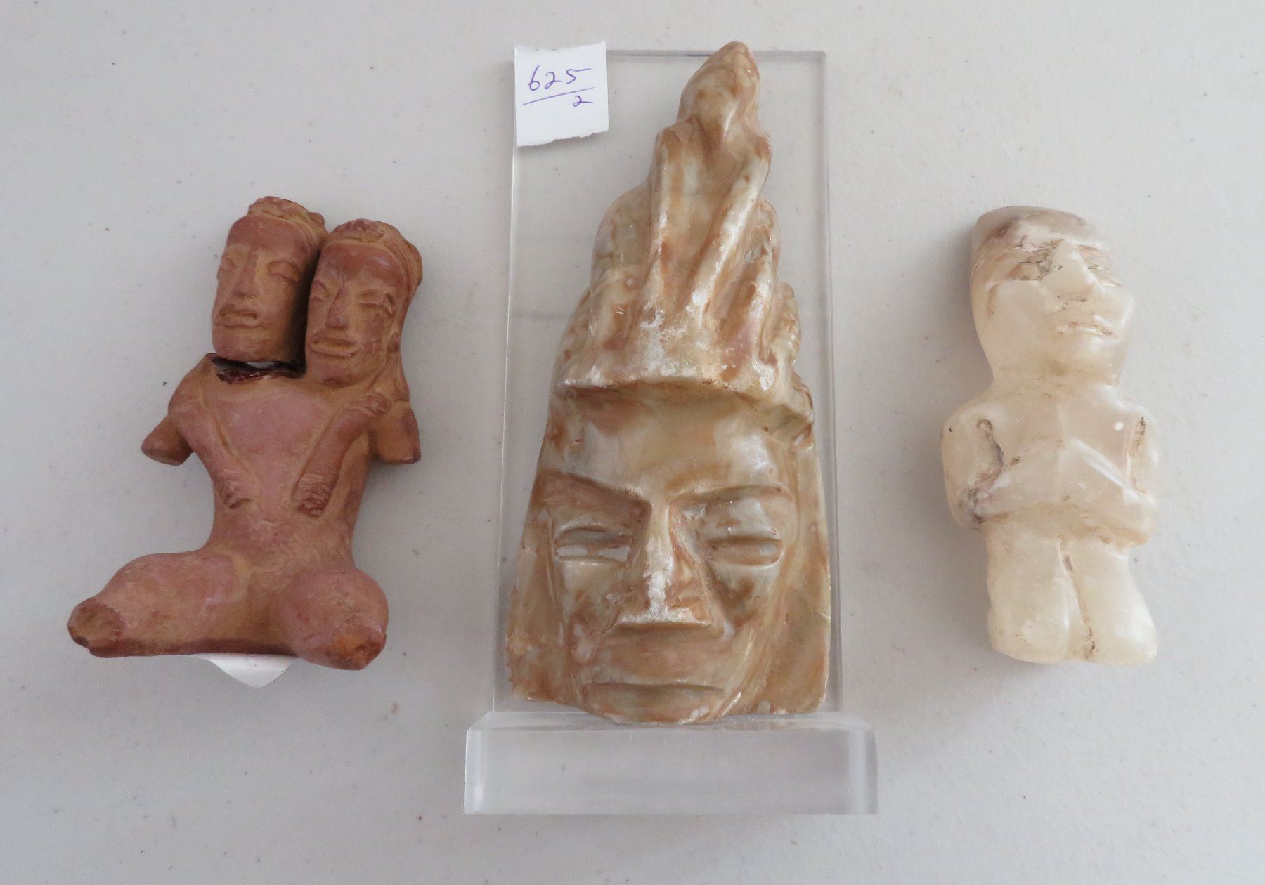 3 Human Figures, pre-Columbian-style. Made of clay, crystal and alabaster, the largest measures 7". Central Mexico. Condition: Head broken on one, see images. Shipping: $32.50 w/insurance and signature, due to weight.