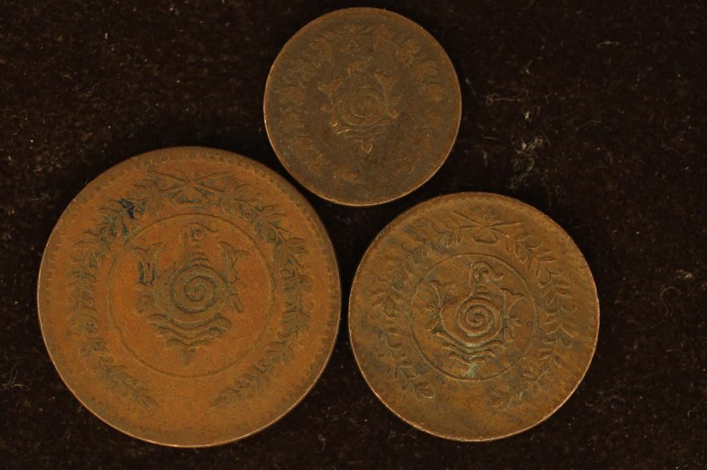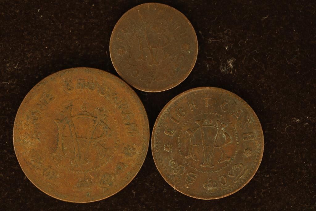 COPPER 1 CHUCKRAM, COPPER 8 CASH AND BRONZE 4 CASH.