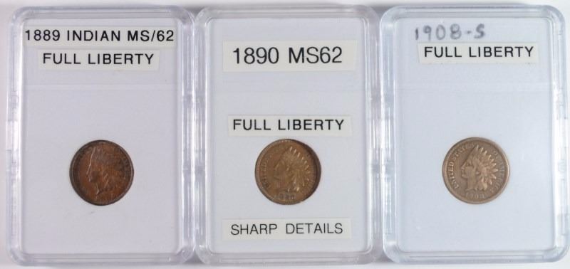 3 INDIAN HEAD CENTS 1908-S KEY DATE VF, 1890 XF, 1889 XF/AU