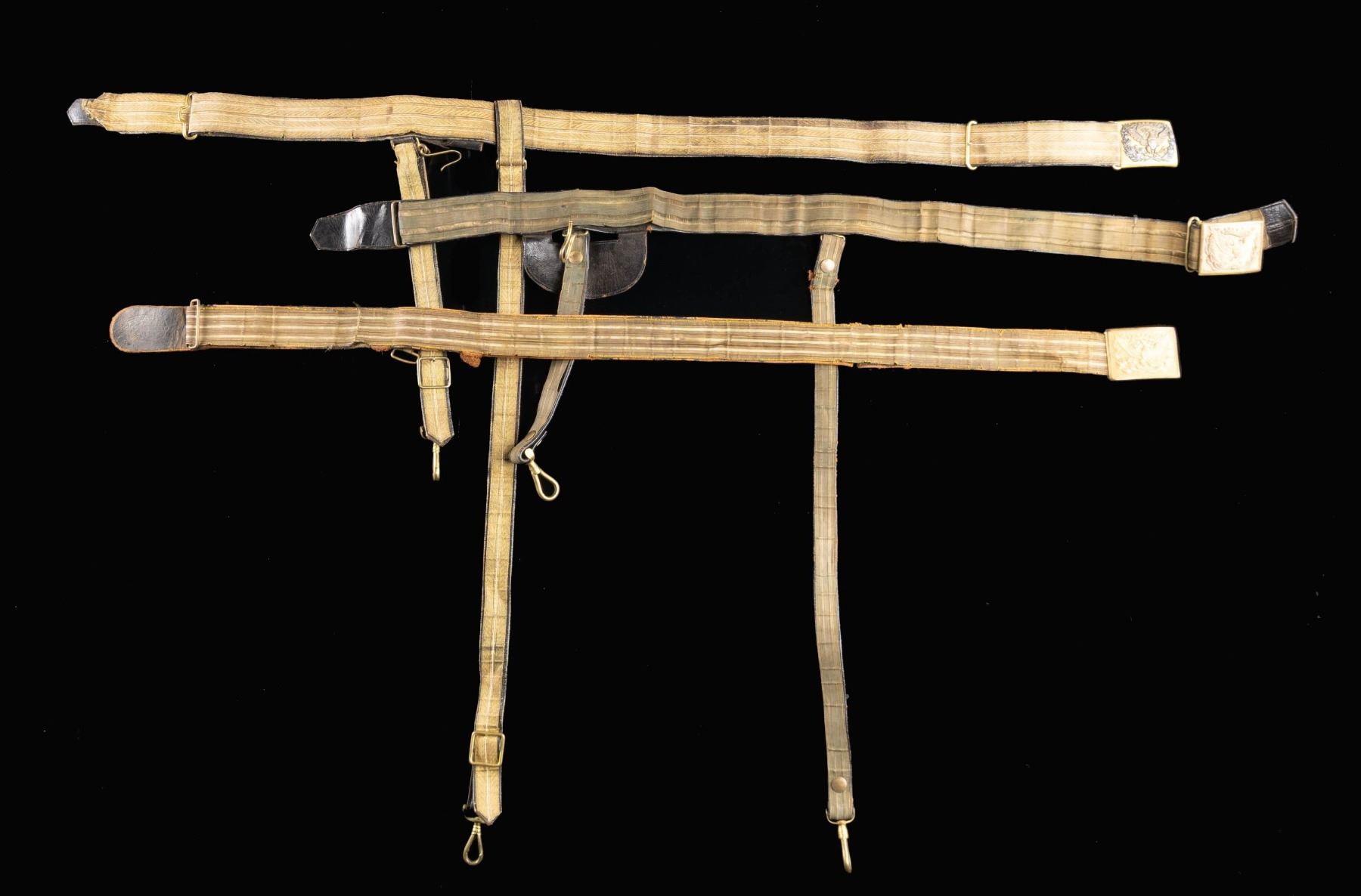 1) A stunning Indian Wars gold bullion Officer's belt with gold bullion sword straps. The high grade 2-piece M1851 sword belt plate has a gold base and a silvered wreath and eagle. The reverse is marked "J. STARKEY 23 CONDUIT ST LONDON". 2) A fine Indian Wars gold bullion Officer's belt with gold bullion sword straps. The heavy 2-piece M1851 sword belt plate is gilded and the reverse is unmarked. 3) A rough Indian Wars gold and silver bullion Officer's belt. The heavy 2-piece M1851 sword belt plate has a gilded finish. CONDITION: all belts show average wear except as noted. (02-25127/BF). $400-600.