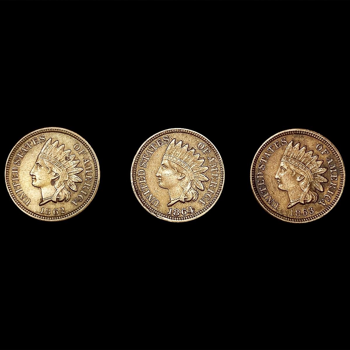 (3) Indian Head Cents (1862, 1863, 1864) CLOSELY
