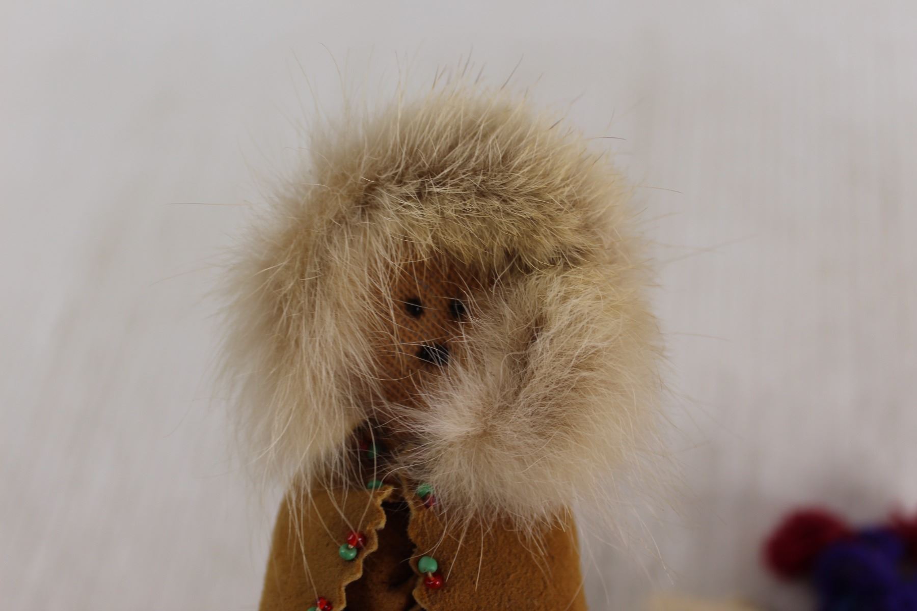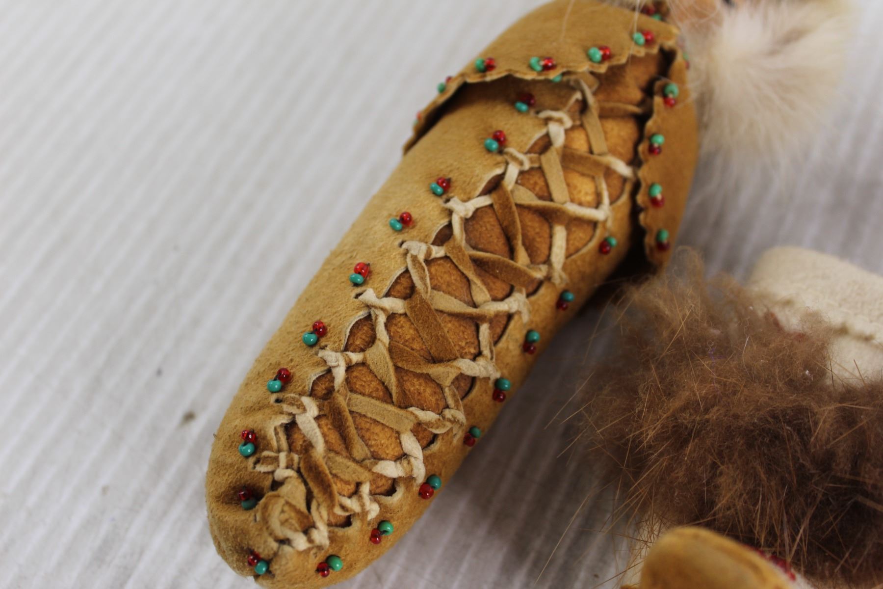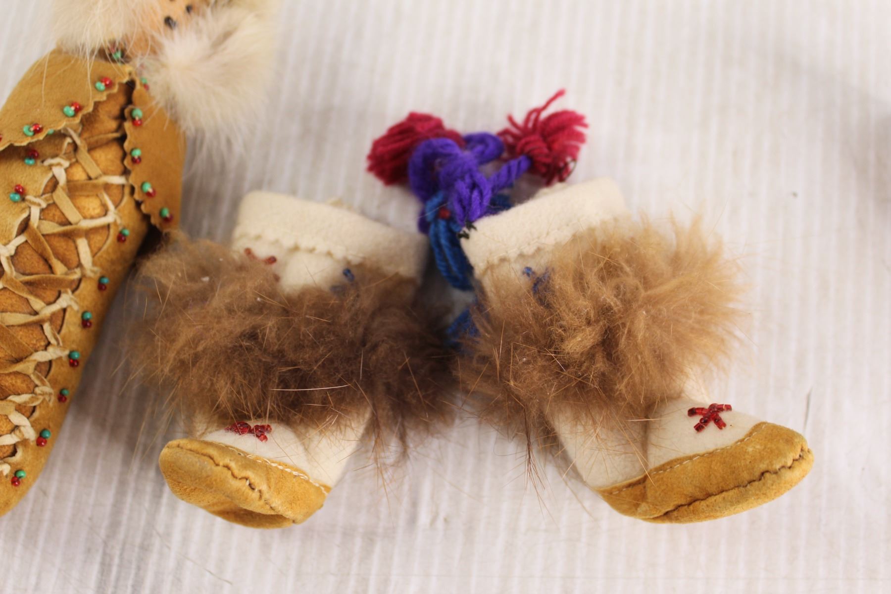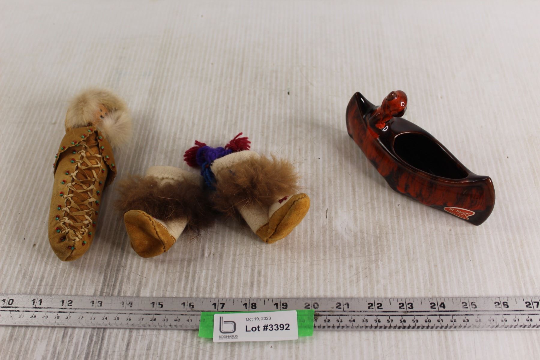 (3) Indigenous-Themed Decorative Items - Mukluks, Baby, Red Pottery McMaster Red Pottery Canoe