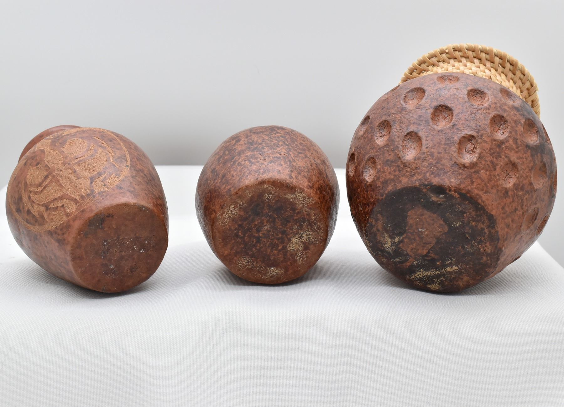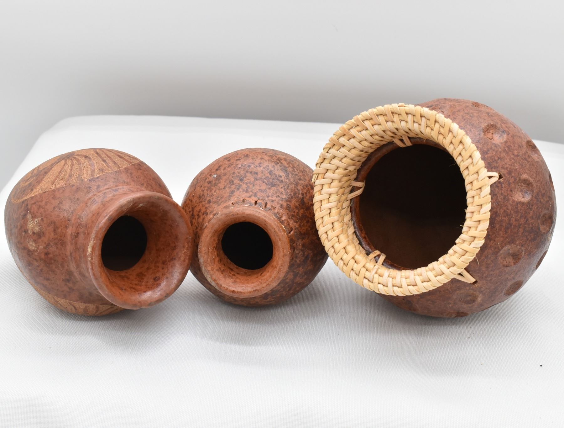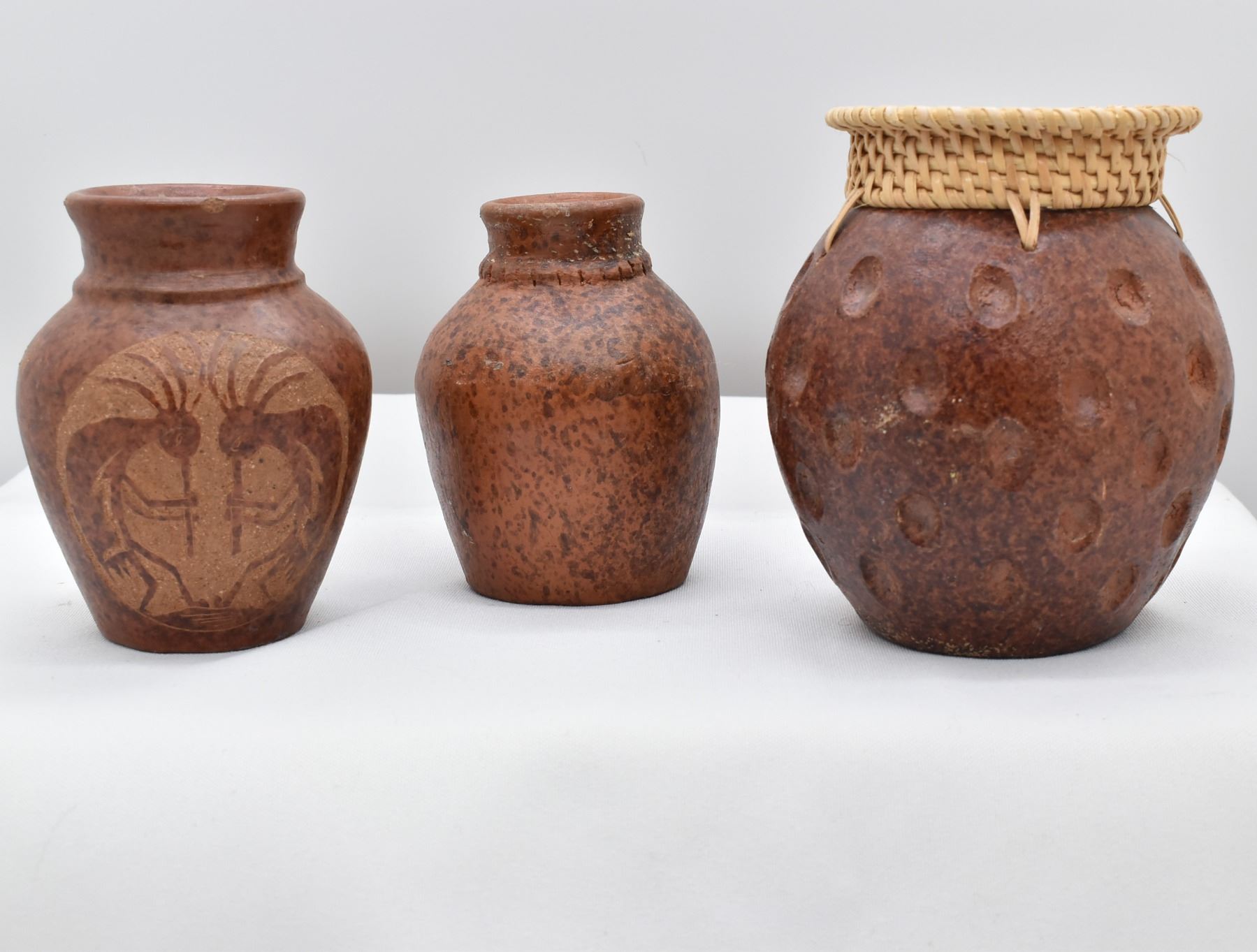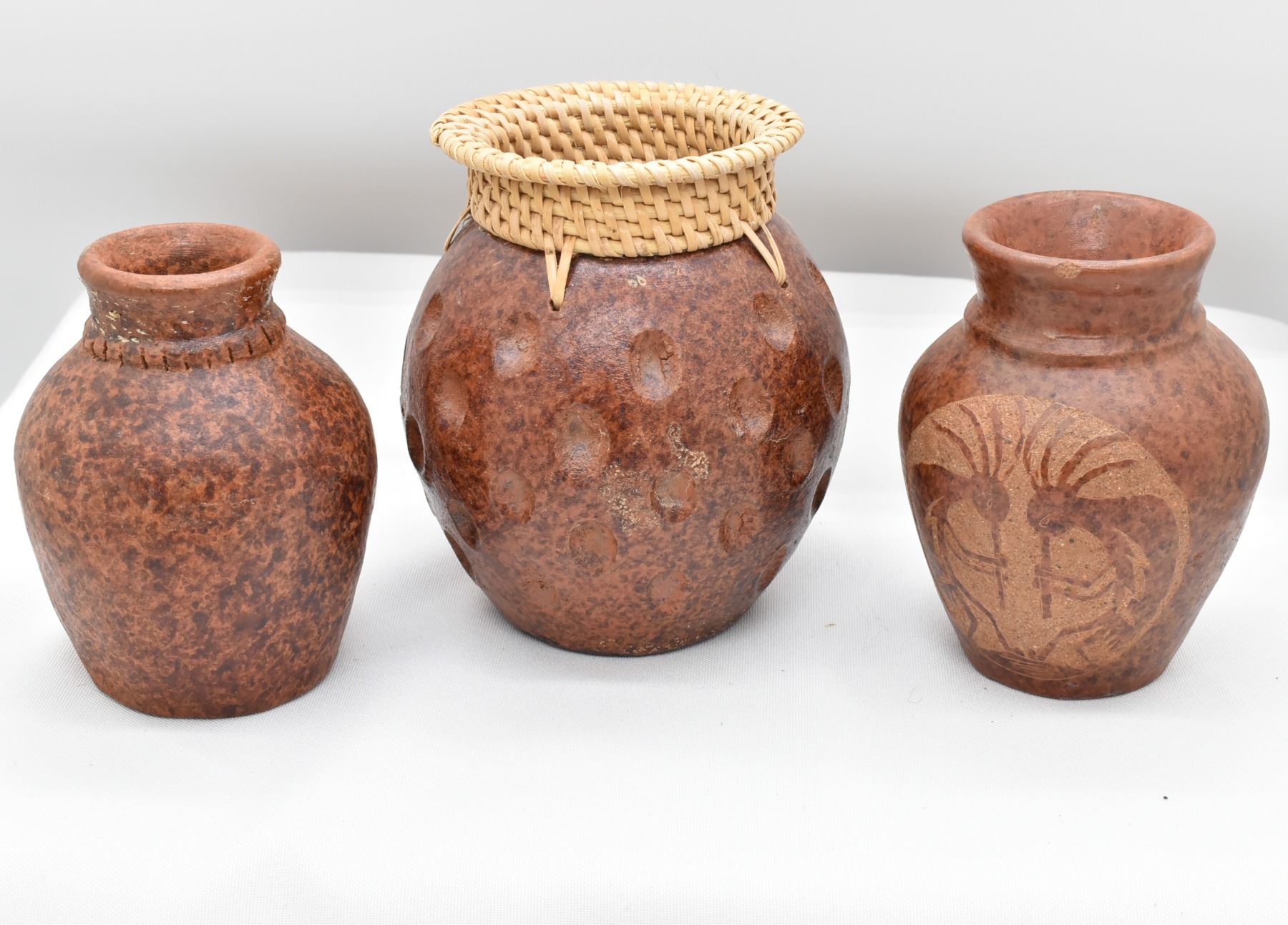 3 Indonesian Pottery Vases, 1 has wicker around the rim, tallest measures 4.5'' x 5'', one has Kokopelli motif
