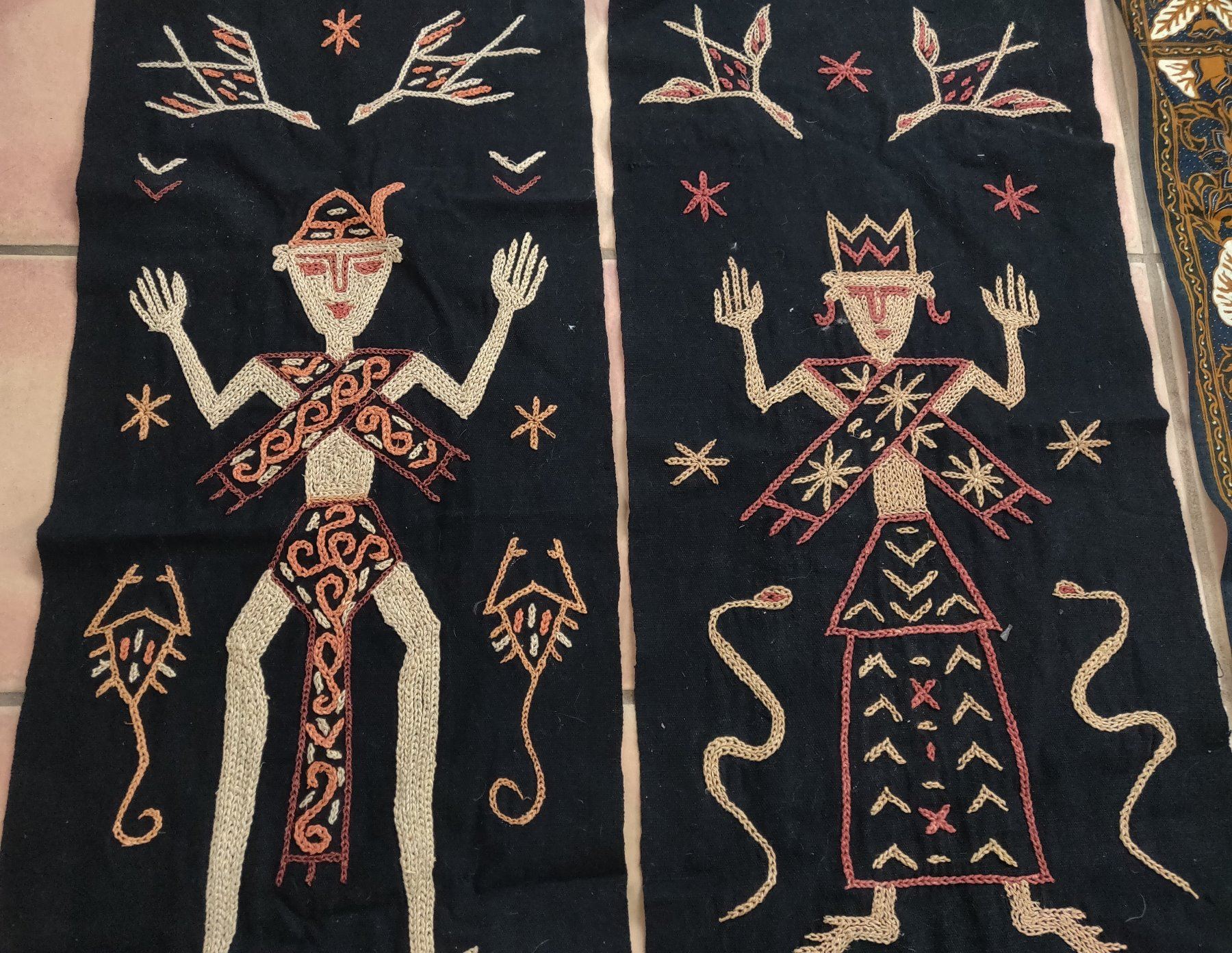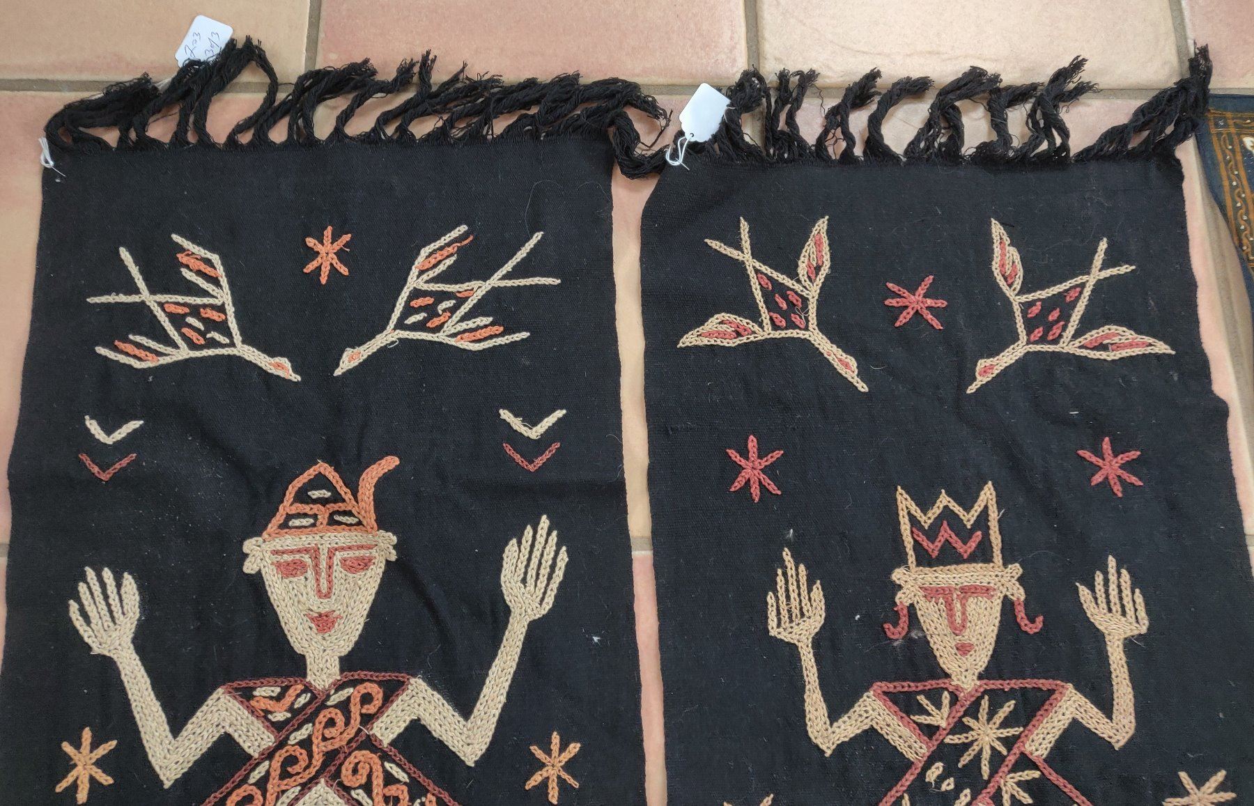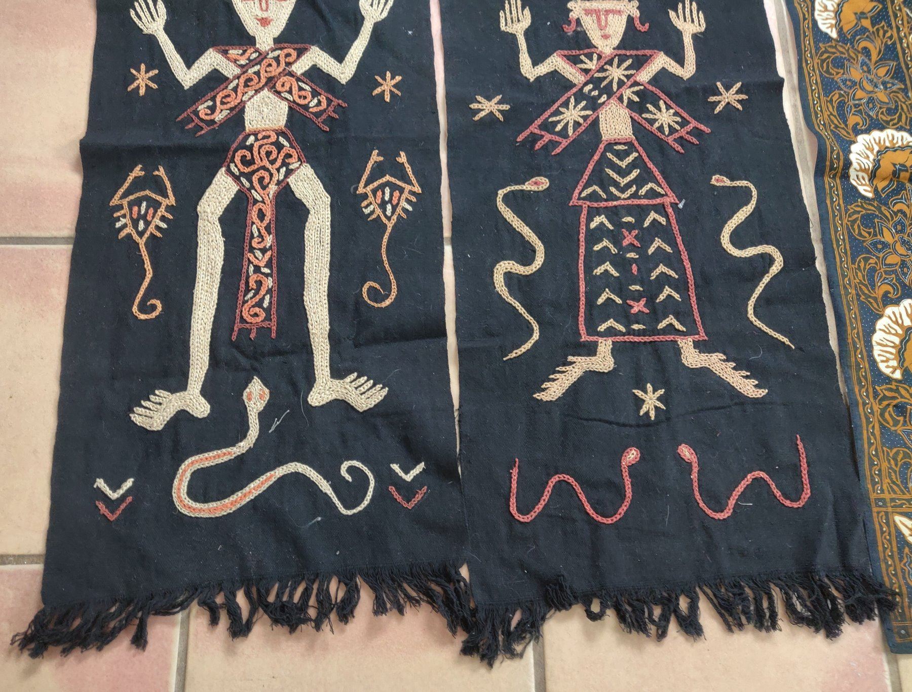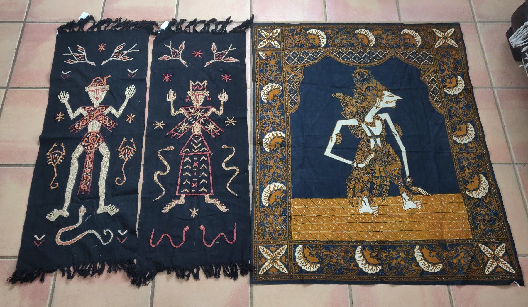3 Indonesian Weavings, c. 1940s. Made of cotton and fiber overlay, one item measures 38" x 32", the other two are about 38" x 14". Indonesian, Sumba. Condition: Good, see images. Shipping: $24.50 w/insurance and signature, due to value.
