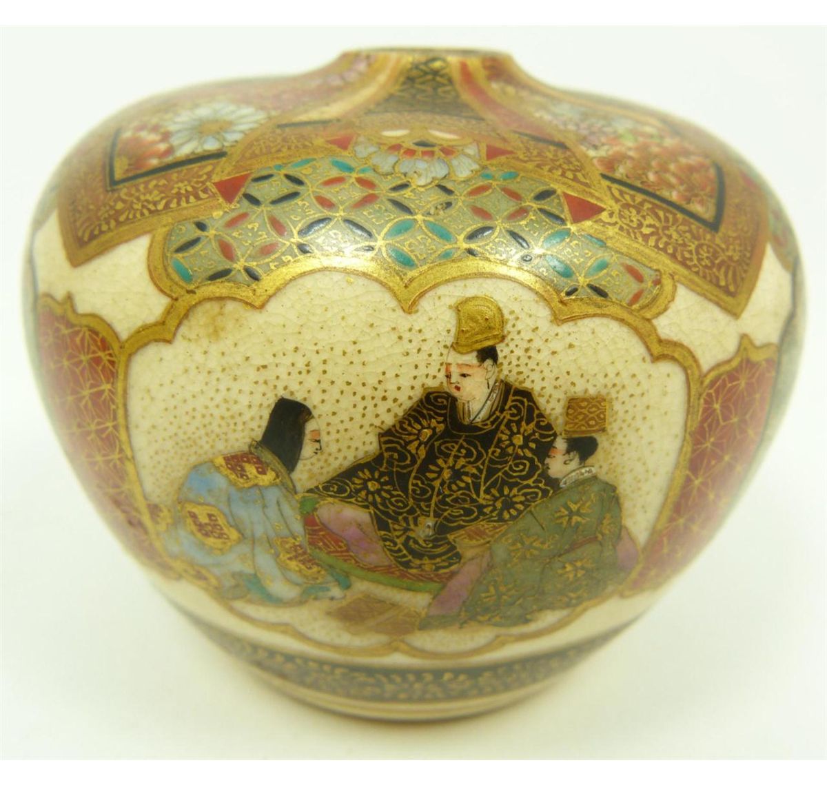 3 antique Satsuma Japanese porcelain miniature vases. Has hand painted scenes with wisemen, women and children. Each holding hand painted calligraphy marks to bottom. Tallest piece measures 3 7/8" height (9.8cm). Total weight of 296 grams.