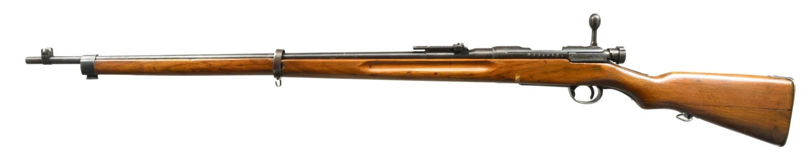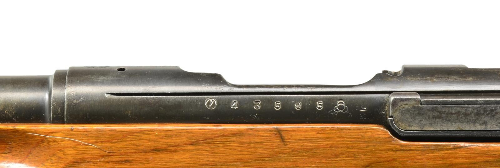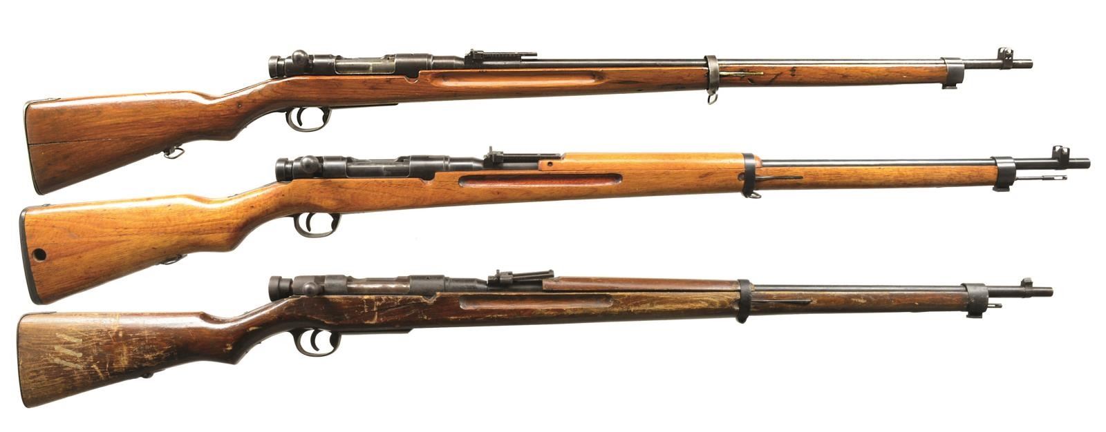 1) TYPE 38 RIFLE W/ "DUFFLE CUT" STOCK. Cal. 6.5 Jap. S# 43585. Bbl. 31". Nonmatching numbers. Receiver is marked on left rail w/ Koshikawa Arsenal marking. Receiver ring marked on top w/ intact mum & “Type 38” characters. Ladder rear sight graduated to 2400m. Inverted V front sight w/ protective ears. Cleaning rod is not present. Straight bolt handle w/ oval knob. Checkered sm. tang safety knob. Hardwood buttstock has 2 piece construction. Handguard is not present. Forend has "duffle cut" at lower band & is separated. CONDITION: stock has heavy refinish w/ extensive loss of wood. Metal retains 75% original thinning blue finish w/ wear & handling marks. Fair, worn bore turning dark. (20-2271/RW). MODERN. 2) Cal. 6.5 Jap. S# 91291. Bbl. 31". Numbers match on receiver, bolt & bayonet lug. Receiver is marked on left side w/ Nagoya Arsenal marking. Mum has been ground, leaving “Type 38” characters. Straight bolt handle w/ oval knob. Checkered, notched safety knob. Aperture ladder rear sight graduated to 2400m. Inverted V front sight w/ protective ears. 29 1/2" Cleaning rod. Hardwood stock set has 2 piece construction & cup type buttplate. Stock has approx. 1 1/2" transverse hole in front of buttplate. CONDITION: stock set has arsenal rework type finish w/ loss of wood, light wear, scratches & handling marks. Metal has been given arsenal rework type blue finish, retaining 85% finish w/ light wear & handling marks. Good shiny bore w/ light wear to lands. (20-2272/RW). CURIO. 3) JAPANESE SMOOTH BORE TRAINING RIFLE. Cal. 6.5 Blank. S# 181. Bbl. 31". Receiver marked only w/ S#. Poorly fitted ladder rear sight is graduated to 1700m. Inverted V front sight. Sight is installed in reverse position. Bolt has straight handle w/ oval knob. Fixed extractor at forward end of bolt. Locking end of left side is shallow. Locking is accomplished by extended bolt handle roof in safety notch. Notched safety knob. Bbl. appears to be fitted into chamber portion w/ loose fit, easily turned by hand. Upper band w/ bayonet lug retained by wood screws. Slotted tip of cleaning rod protrudes from end of forend but appears to be fixed in position. Solid lower band has provision for swivel, which is not present. Band spring is wire type. Follower & mag. spring are not present. Hinged floorplate is functional. Hardwood stock set made w/ out usual 2 piece construction. Flat, stamped buttplate. Butt swivel base w/ out swivel retained by Phillips head screws. CONDITION: stock set has heavily worn finish, flaking, dents & scratches. Handguard retained at rear by brads. Metal has 50% original blue type finish turning patina w/ oxidation & fine pitting throughout. Bore is dark & rough w/ appearance of pitting. (20-2273/RW). CURIO. $700-900.