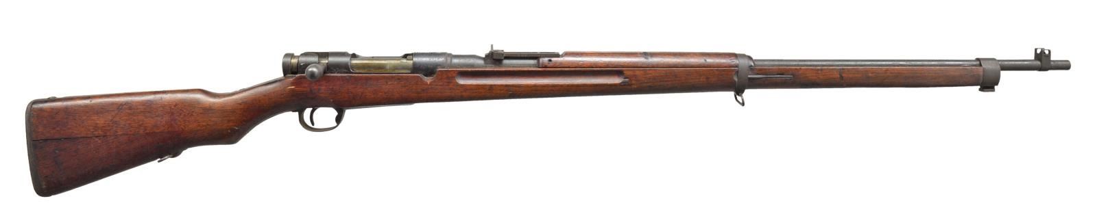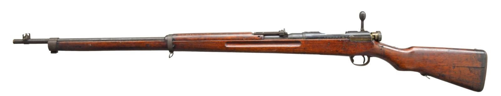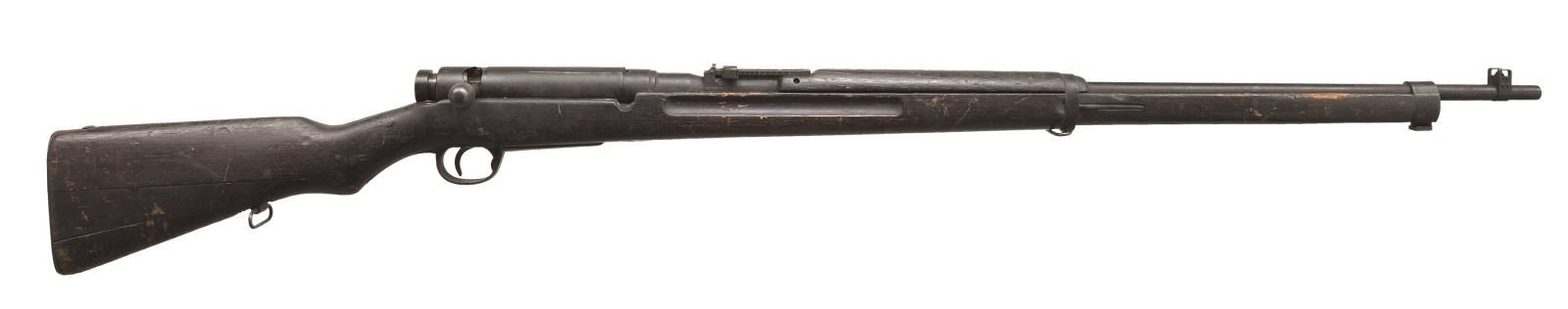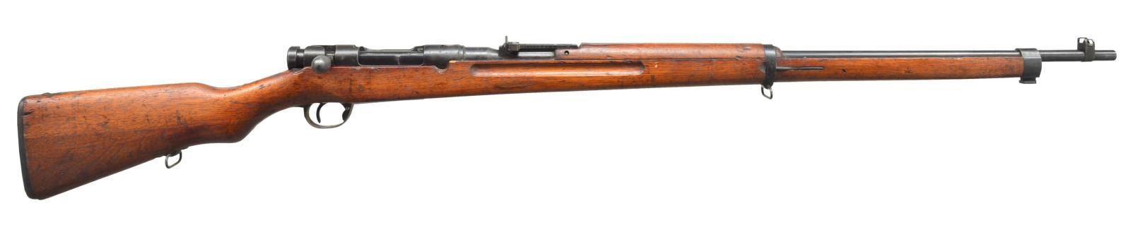 1) Cal. 6.5 Jap. S# 606 71. Bbl. 31". Numbers match on receiver & bayonet lug. Receiver marked on left side w/ Nagoya Arsenal mark. Has nearly intact Mum w/ 2 chisel marks. Mum & Type 38 characters have been enhanced in white. Ladder aperture rear sight graduated to 2400m. Inverted V front sight w/ protective ears. Oval bolt knob & notched checkered safety knob. Cleaning rod is not present. Hardwood stock set w/ cup type buttplate. CONDITION: original finish stock set has moderate wear, dents, staining & scratches throughout. Buttstock dovetail is notably open. Metal has 60% blue turning patina w/ wear & scattered spots of oxidation. Very good shiny bore. (20-2916/RW). 2) Cal. 6.5 Jap. S# 65288. Bbl. 31". Numbers match on receiver, bolt & dust cover. Receiver marked on left side w/ Koishikawa Arsenal marking. Mum & characters are intact. V-notch ladder rear sight graduating to 2400m. Inverted V front sight w/ protective ears. Bolt has oval knob & notched checkered safety knob. Cleaning rod is not present. Hardwood stock set. Flat steel buttplate. CONDITION: rear tang screw & front guard screw are not present. Stock set has wear, dents & scratches w/ dark stained appearance throughout. Notable crack in toe area on both sides & chipping & gouges at toe area. Crack in top of handguard. Missing chip & sm. gouges behind upper band. Fair bore turning dark. (20-2944/RW). 3) Cal. 6.5 Jap. S# 79322. Bbl. 31". Numbers match on receiver, bolt & bayonet lug. Receiver is marked on left side w/ Nagoya Arsenal marking. Mum has been ground leaving Type 39 characters. Aperture ladder rear sight graduated to 2400m. Inverted V front sight w/ protective ears. Oval bolt knob w/ checkered notched safety knob. Cleaning rod is not present. Hardwood stock set w/ cup type buttplate. CONDITION: original finish stock set has generally better appearance w/ moderate wear, dents, staining & scratches. Metal retains 80% original blue finish w/ light wear & scattered spots of oxidation. Front sight protective ear on right side is notably bent. Very good shiny bore. (20-2965/RW). ALL CURIO. $700-1,100.