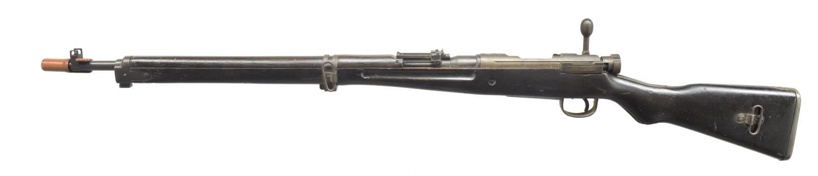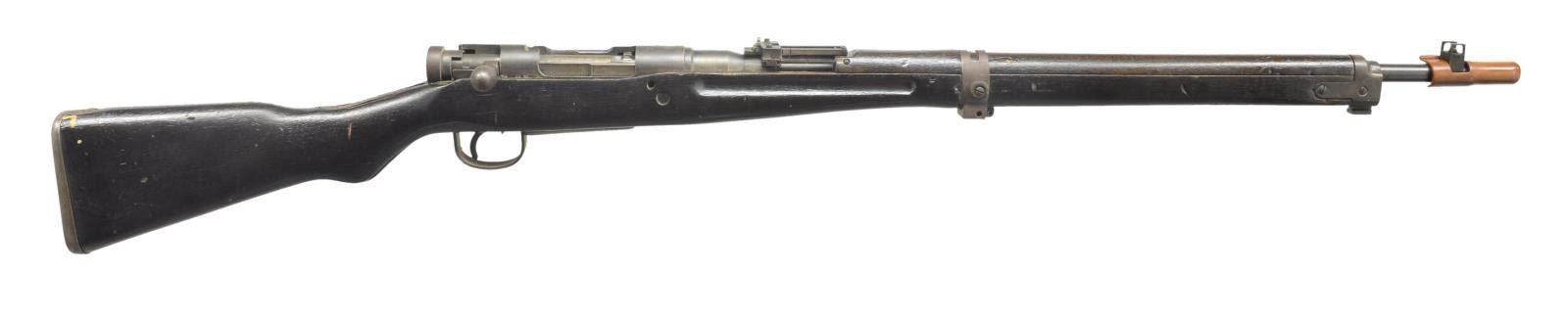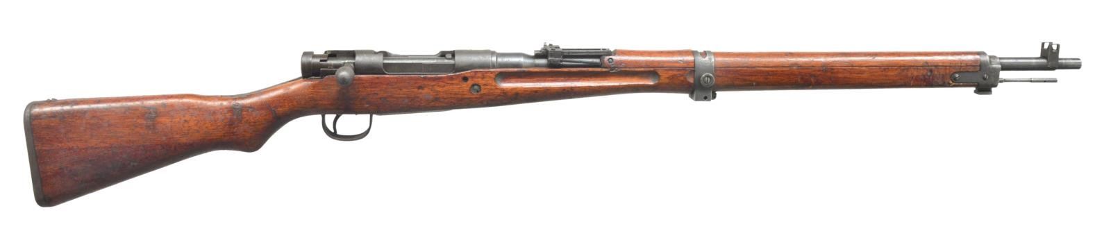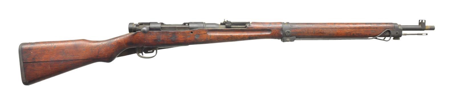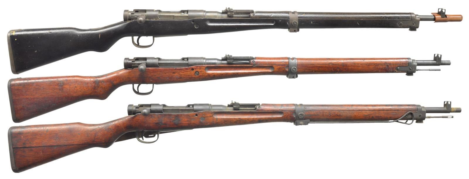 1) TYPE 99. Cal. 7.7 Jap. S# 79457. Bbl. 25 1/2". S# match on receiver, bolt & bayonet lug. Receiver marked on left side w/ Kokura Arsenal marking. Mum has been ground leaving Type 99 characters. Ladder aperture rear sight graduated to 1500m w/ anti-aircraft wings. Inverted V front sight w/ protective ears. Oval bolt knob. Notched checkered safety knob. 23 3/4" Cleaning rod. 3-Screw upper band. Lower band has mono pod mount. Sm. recoil bolt. 2-Screw rear swivel. Cup type buttplate. Hardwood stock set w/ long handguard. CONDITION: stock set has been given very dark brown painted finish w/ light wear, scratches & handling marks throughout. Metal has turned overall gray & patina w/ traces of blue. Very good shiny bore. (20-2909/RW). 2) TYPE 99. Cal. 7.7 Jap. S# 24787. Bbl. 25 1/2". All visible numbers match. Receiver marked on left side w/ Nagoya Arsenal marking. Has intact Mum & Type 99 characters. Ladder aperture rear sight graduated to 1500m. Inverted V front sight w/ protective ears. Oval bolt knob. Notched checkered safety knob. 23 3/4" Cleaning rod. 3-Screw upper band. Mono pod is present. Sm. recoil bolt. 2-Screw butt swivel. Cup type buttplate. Hardwood stock set w/ long handguard. Rubberized canvas sling w/ large steel buttplate. UNATTACHED ACCESSORIES: original brown plastic muzzle cover. 15 1/2" Fullered blade bayonet w/ curved quillon, right ricasso marked w/ Nagoya Arsenal marking. Birdshead pommel w/ smooth hard wood grip. Scabbard is not present. Bayonet has been sharpened but retains much original blue on blade, balance of metal turning patina. Grips have wear, dents, scratches. CONDITION: stock set has extensive staining w/ wear, dents & scratches throughout. Buttstock joint is notably open. Metal has traces of blue turned overall patina w/ oxidation & scattered fine pitting. Good shiny bore. (20-2910/RW). 3) TYPE 99. Cal. 7.7 Jap. S# 45716. Bbl. 25 1/2". All visible numbers match. Receiver marked on left side w/ Toyo Kogyo Arsenal marking. Mum has been ground leaving Type 99 characters. Ladder aperture rear sight graduated to 1500m. Anti-Aircraft wings are present. Inverted V front sight w/ protective ears. Oval bolt knob. Notched checkered safety knob. 5" Screw in stacking rod. 2-Screw upper band. Open top lower band w/ mono pod mount. Sm. recoil bolt. 2-Screw butt swivel. Cup type buttplate. Hardwood stock set w/ long handguard. CONDITION: stock set has extensive staining w/ wear, dents & scratches throughout. Metal has traces of blue turning gray & patina w/ oxidation & scattered spots of light pitting. Very good shiny bore. (20-2963/RW). ALL CURIO. $800-1,200.