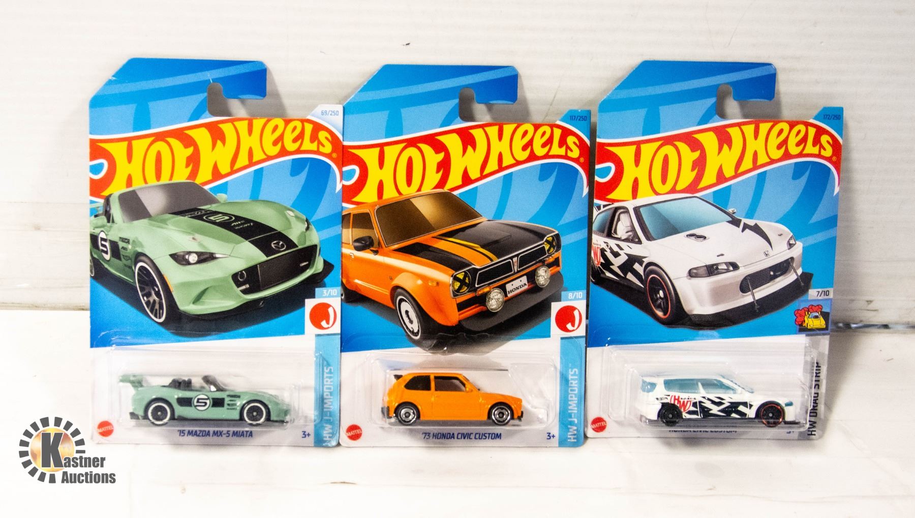3 JDM HOT WHEELS CIVIC, CIVIC, AND MIATA