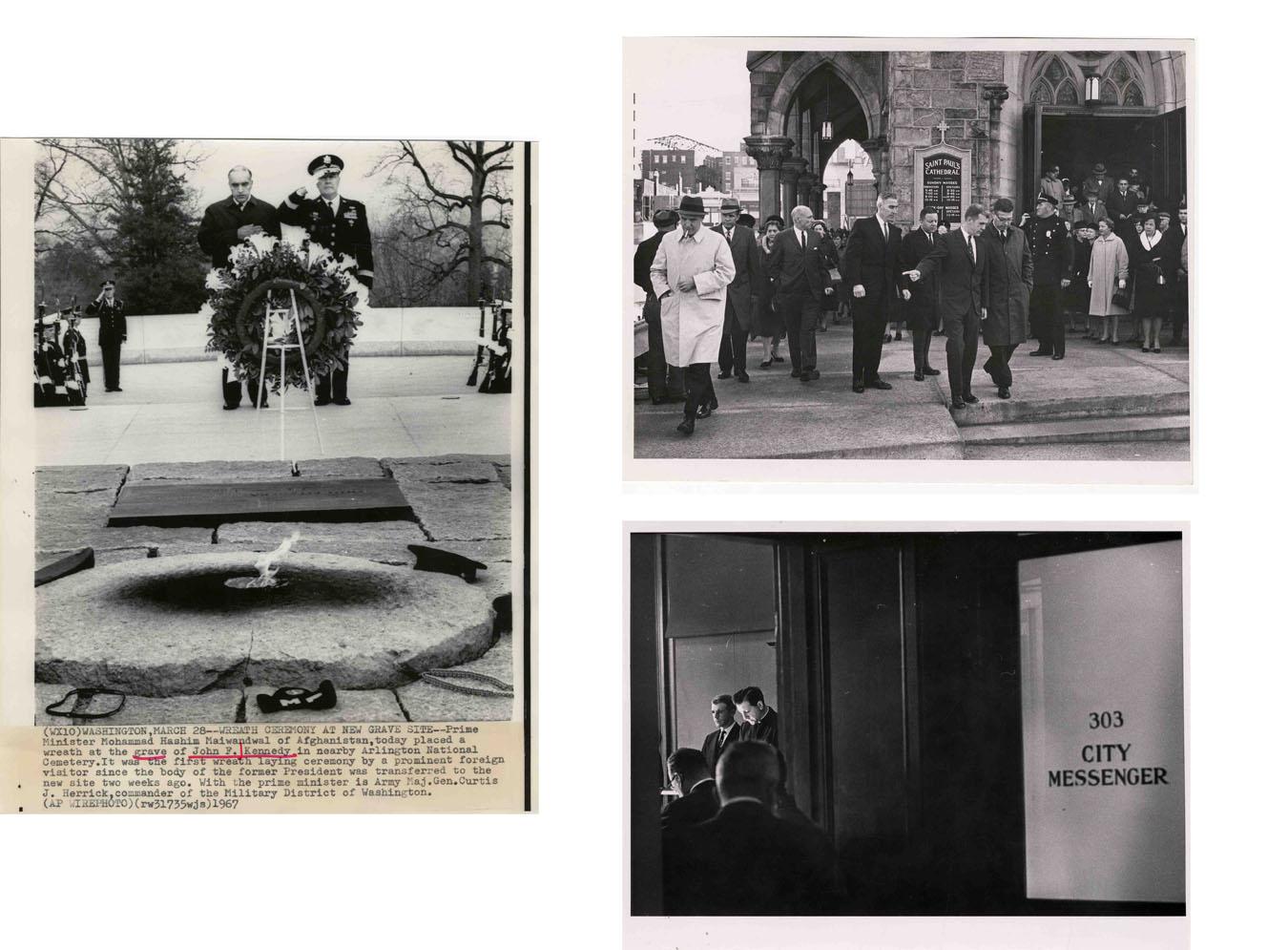 Three original press photos from President John F. Kennedy's memorial service & JFK's grave site. Caption to one photo reads, “...Wreath ceremony at new grave site – Prime Minister...of Afghanistan, today placed a wreath at the grave of John F. Kennedy...It was the first wreath laying ceremony by a prominent foreign visitor...” Two additional photos dated 25 & 26 November 1963. Excellent condition.