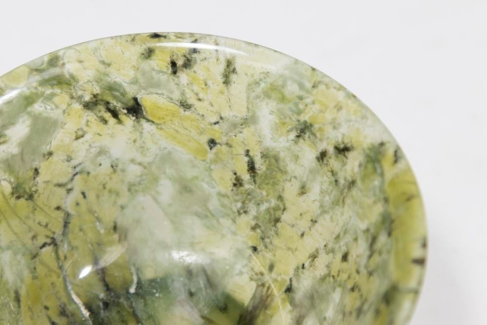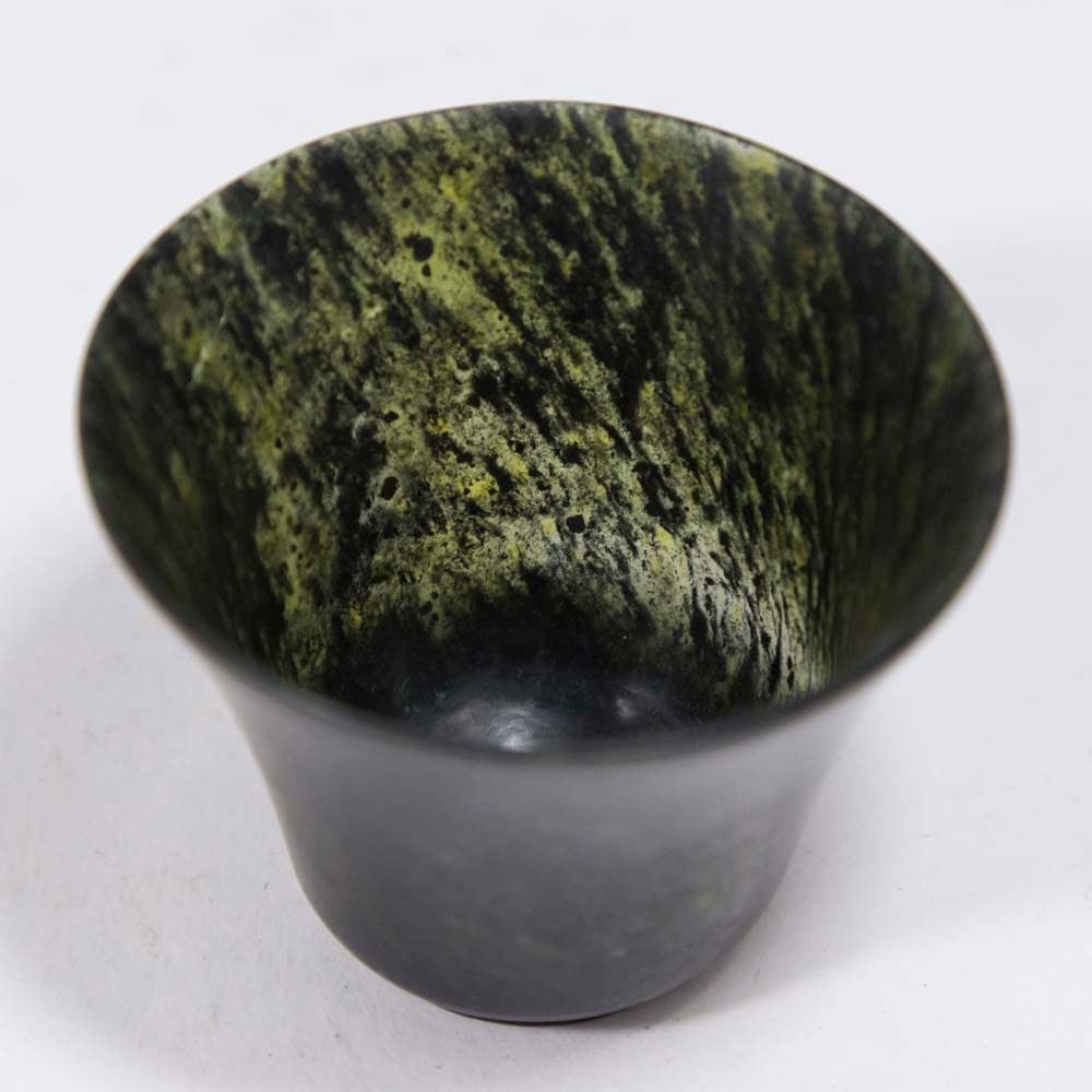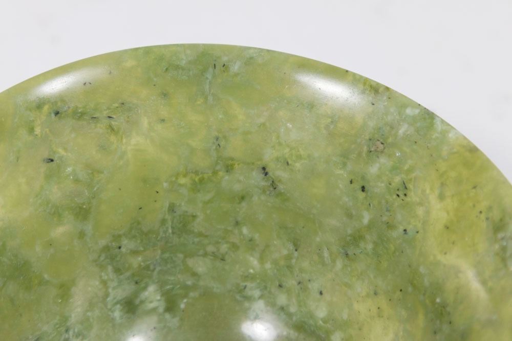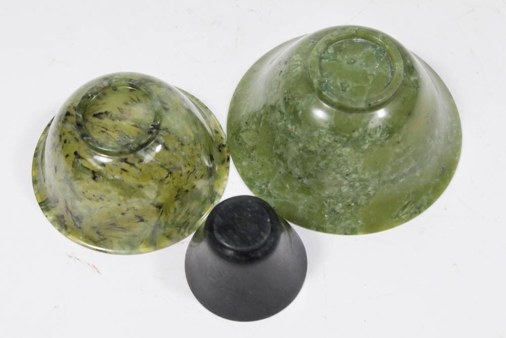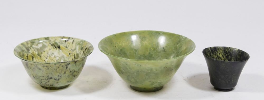 1 spinach jade. Approx. 1 1/3" H, 2" H x 3 3/4" diameter, and 2 1/4" H x 5" diameter. Property from the collection of Hank Willoughby, Allenwood, NJ.