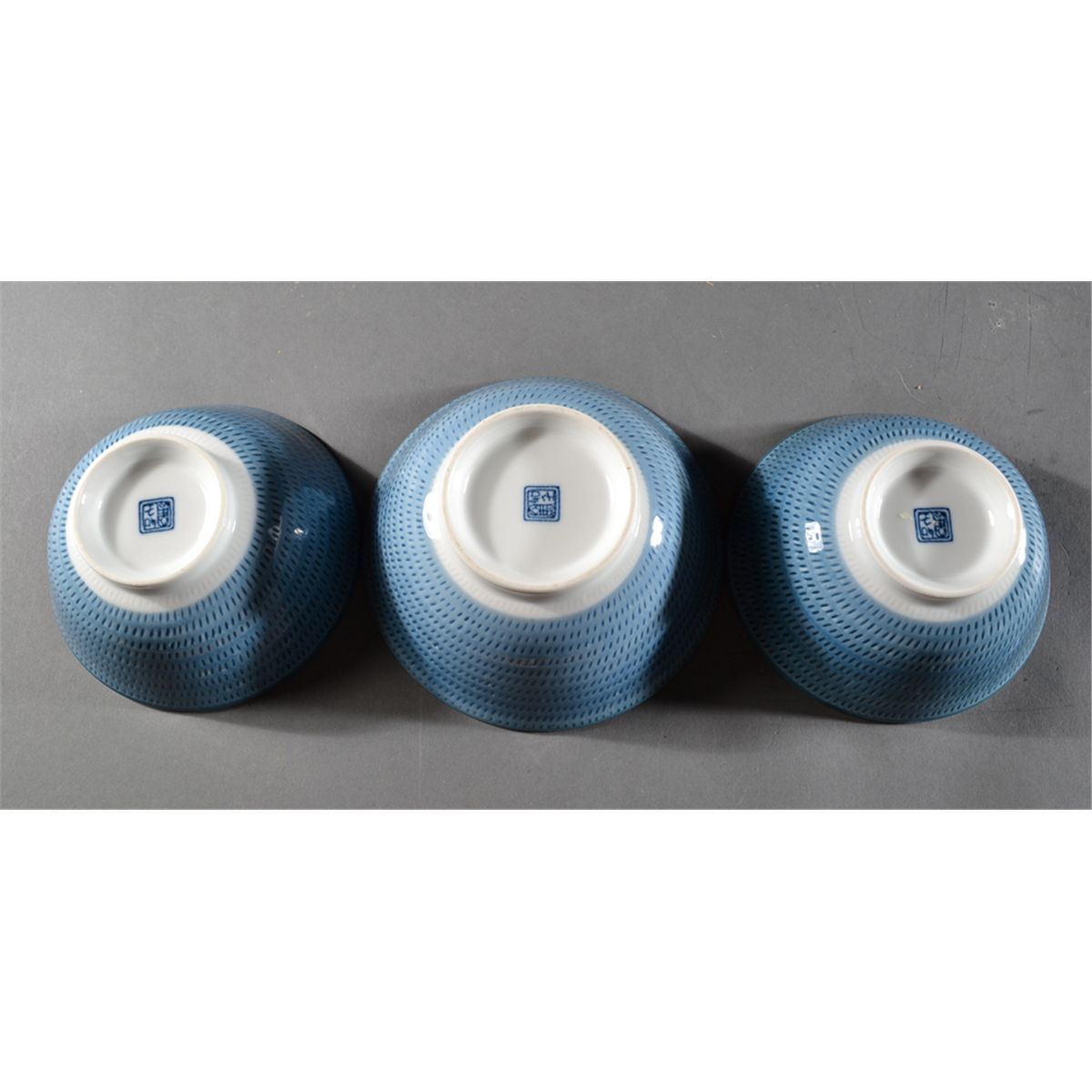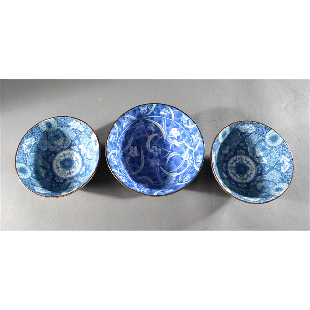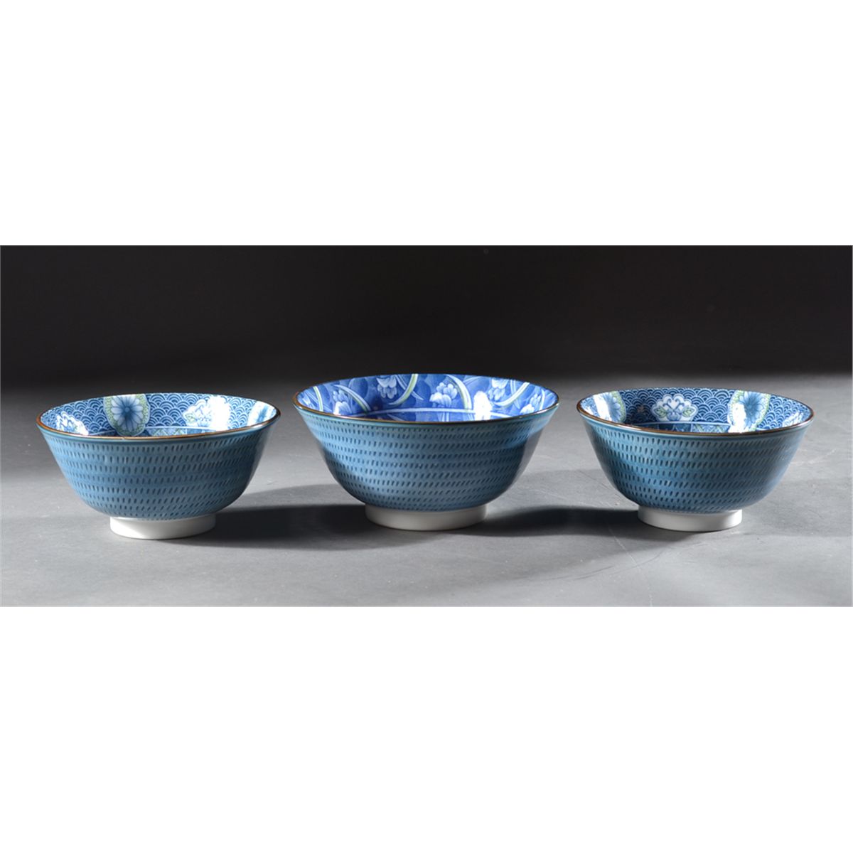 Footed glazed porcelain bowls with floral interiors and deep brown rims, all with blue under glazed character marks. Largest 2.75"H X 6"W. circa 20th century. Private collection St. Claire Shores, MI
